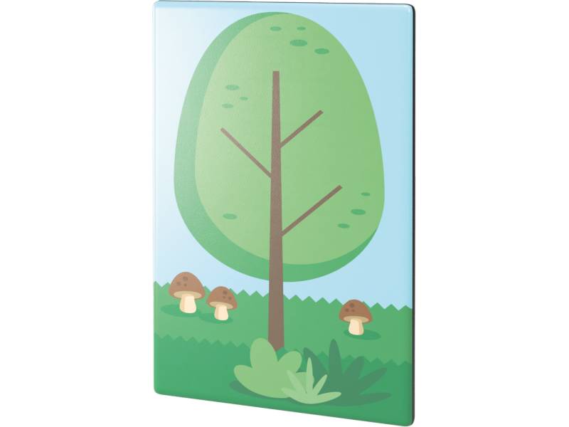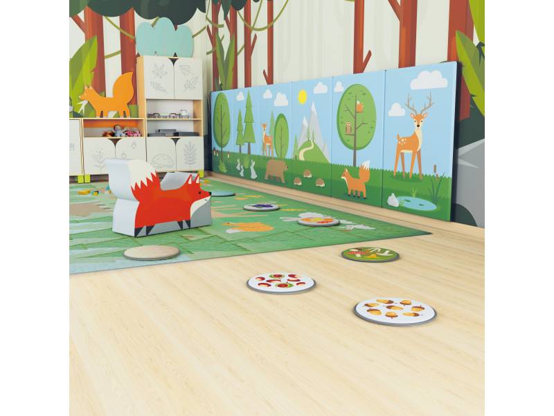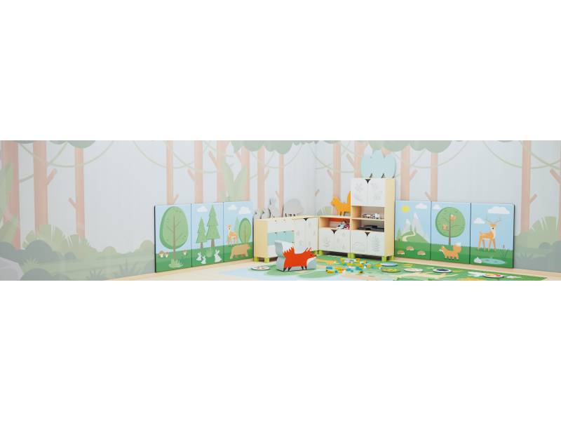 Sienų plokštės minkštumas yra puikus privalumas dėl putplasčio užpildo, padengto lengvai valomu PVC audiniu. Be to, plokštės sumažina triukšmą kambaryje, apsaugo sienas nuo nešvarumų ir amortizuoja bet kokius smūgius. Dėl kabliukų įrengti ir pertvarkyti sienines plokštes lengva. 6 skirtingi paveikslėliai, vaizduojantys mišką ir ekosistemą.