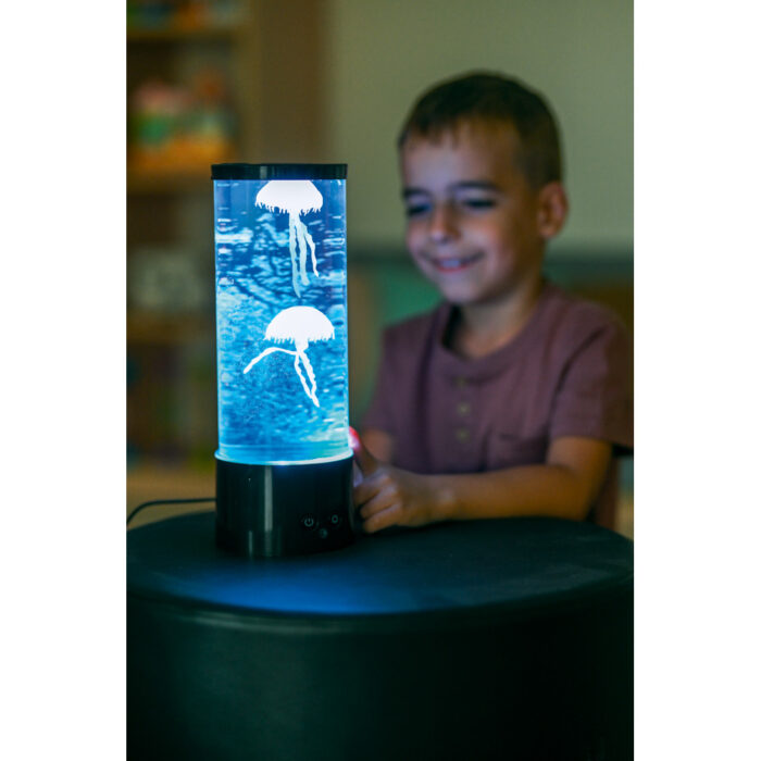 Atsipalaidavimo lempa, kuri puikiai tiktų pojūčių kambariui arba pasaulio patirčių kambariui. Ji pravers kaip priemonė dirbant su vaikais, turinčiais ADHD, sensorinės integracijos sutrikimų ar autizmą. Lempa veikia raminamai, mažina stresą ir padeda atsipalaiduoti. Šviestuvas gali šviesti 12 spalvų, 4 spalvų keitimo režimais ir 3 ryškumo lygiais. Į komplektą įeina ne tik lempa, bet ir šaukštas, USB laidas, dvi dirbtinės medūzos, nuotolinio valdymo pultas ir naudojimo instrukcija.