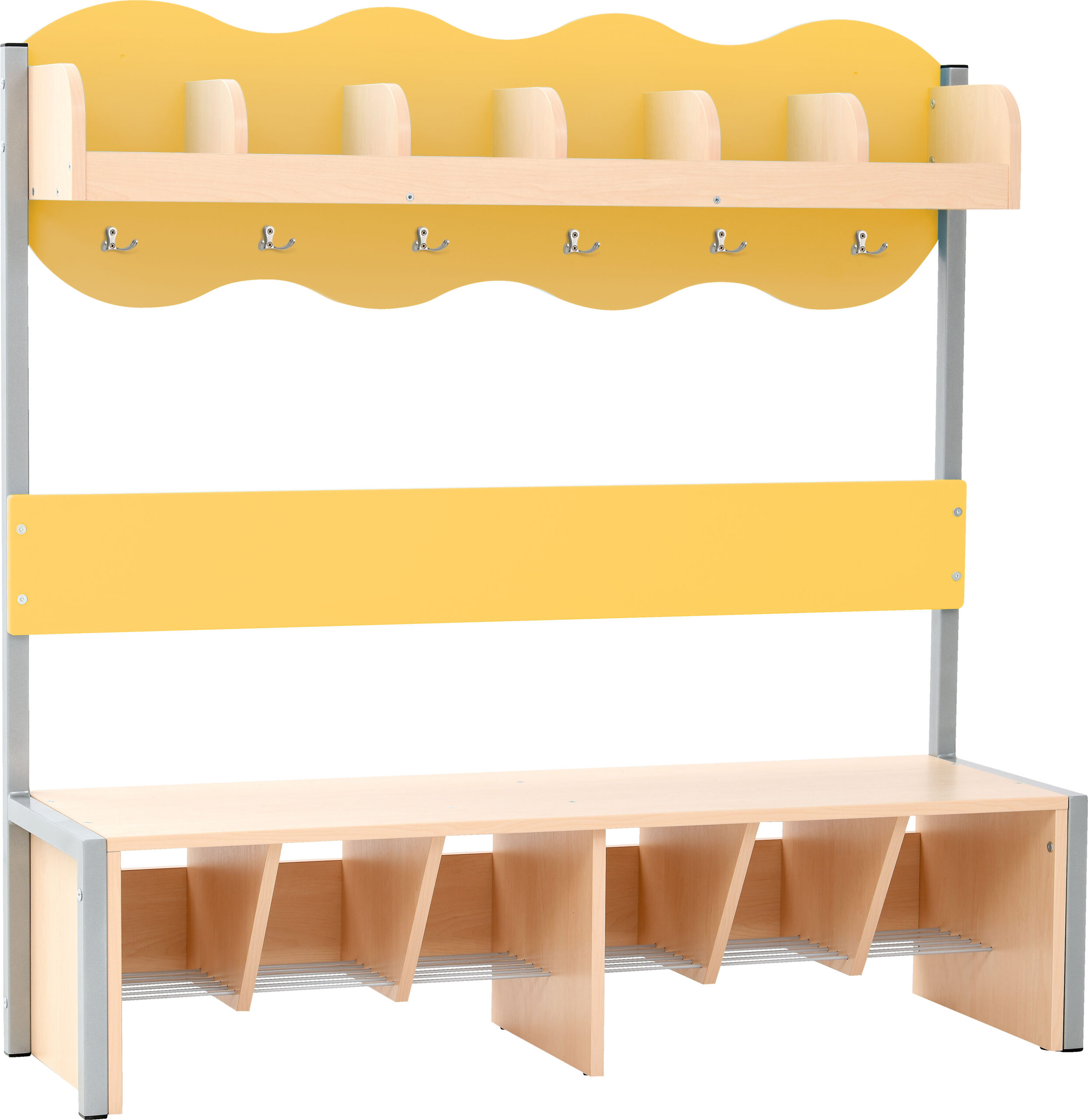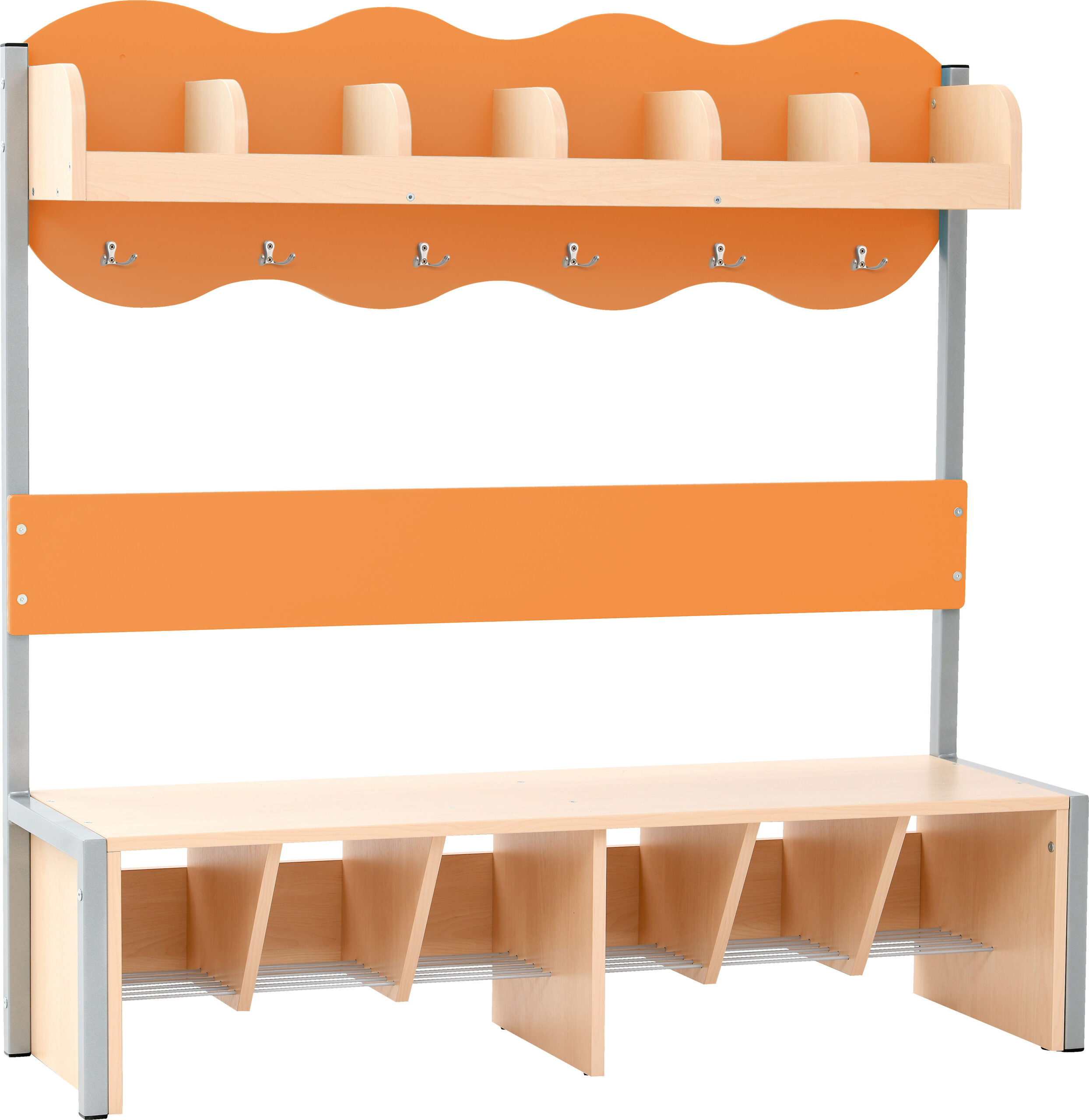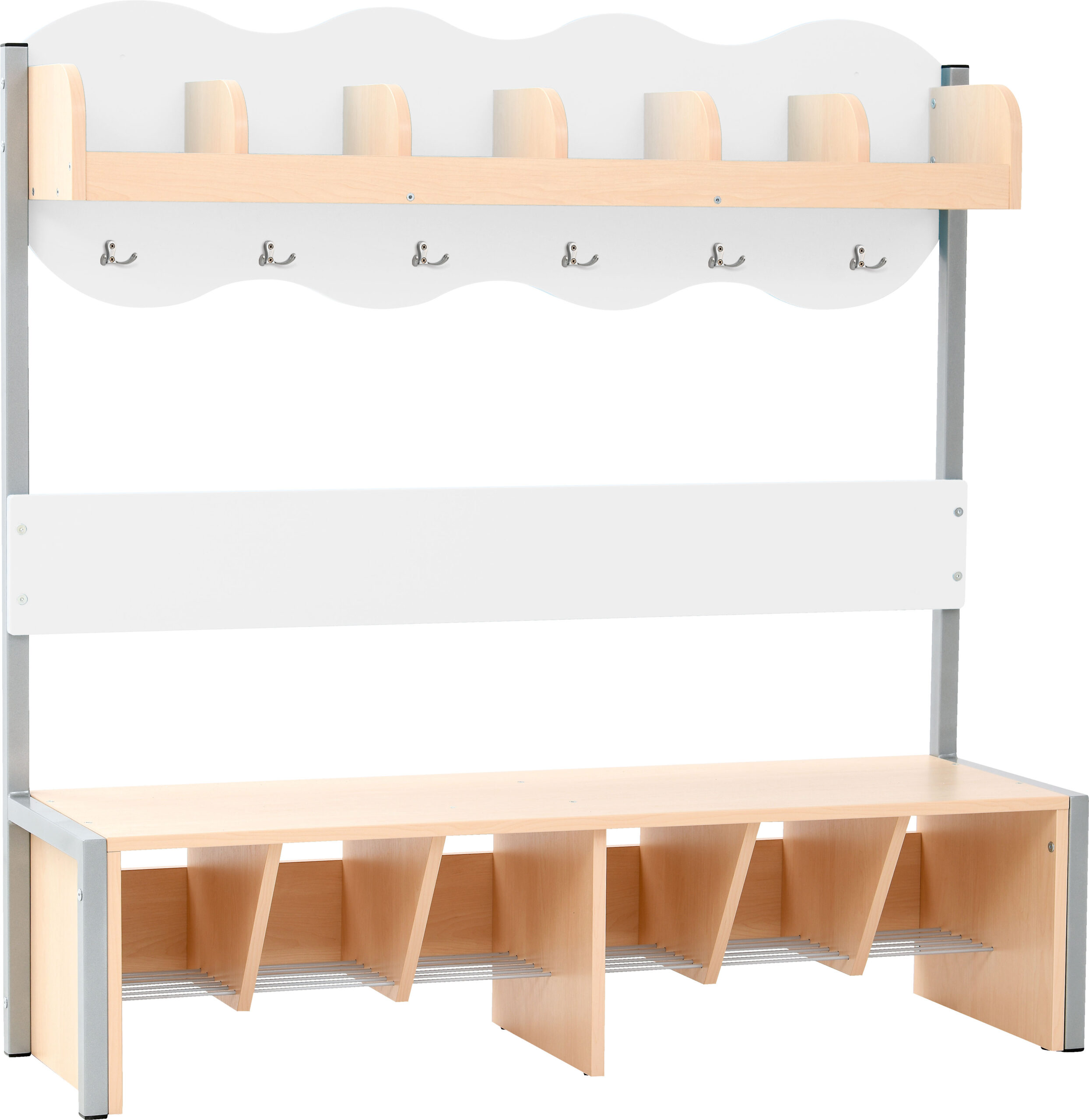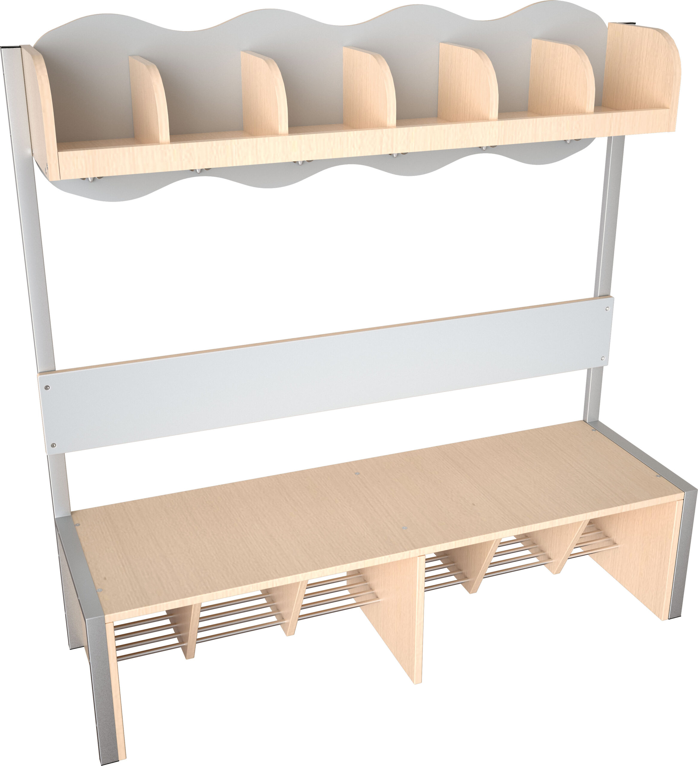 Lentyna su skyriais ir suoliukas pagaminti iš 18 mm storio laminuotos klevo atspalvių plokštės. Po suolu – metalinės batų grotelės, kad apatinė rūbinės dalis būtų švari.