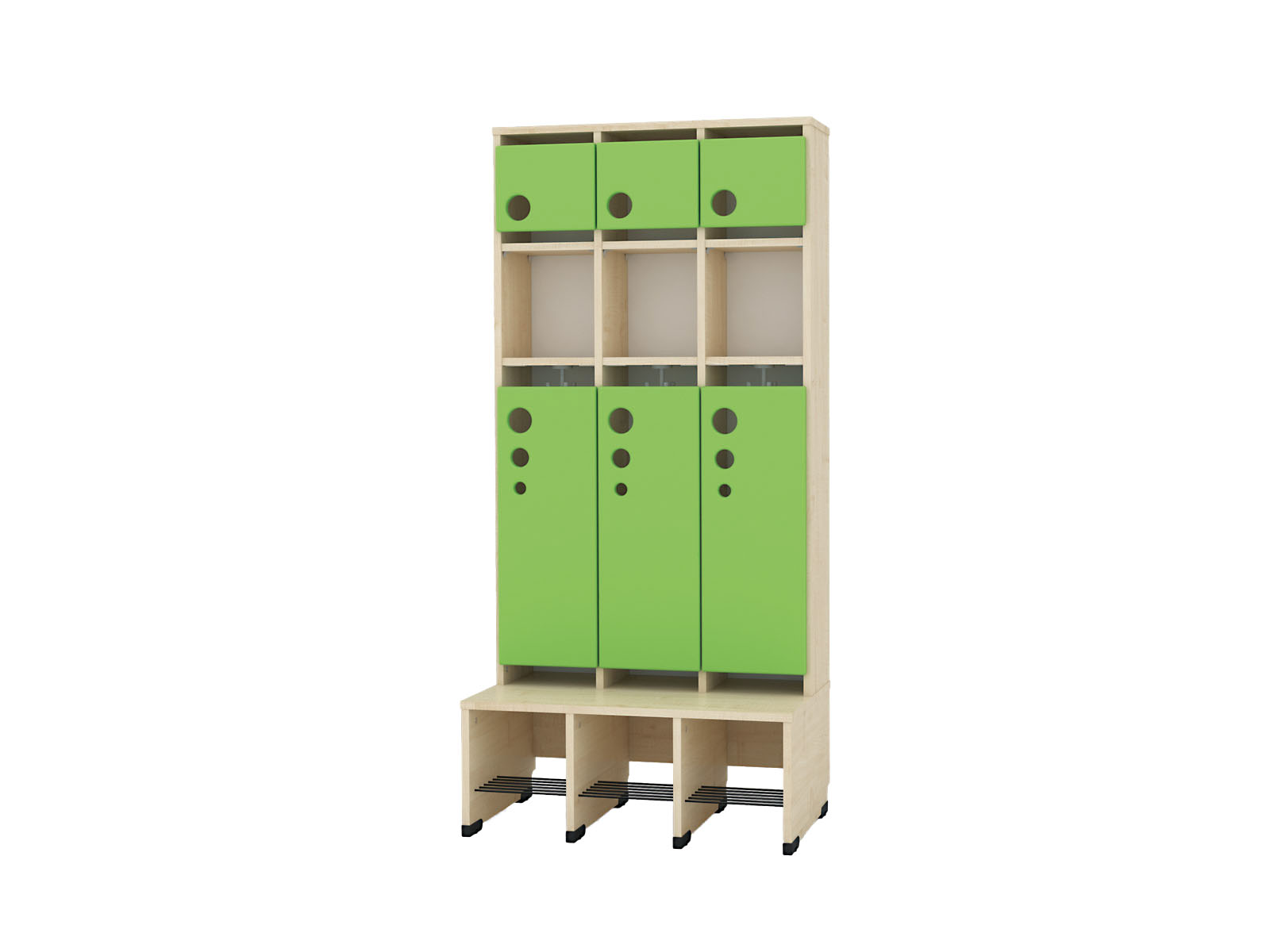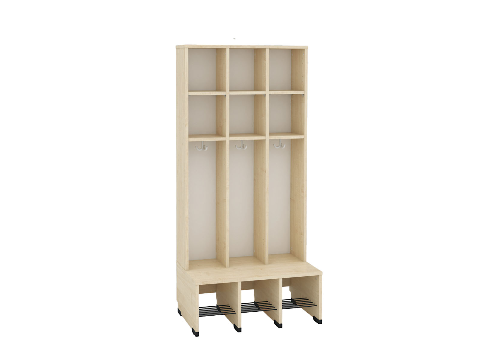 Funkcionalus baldas iš laminuotos plokštės (klevo spalvos), su dviguba lentyna, suoliuku ir batų lentyna su grotelėmis. Tinka 3 vaikams.