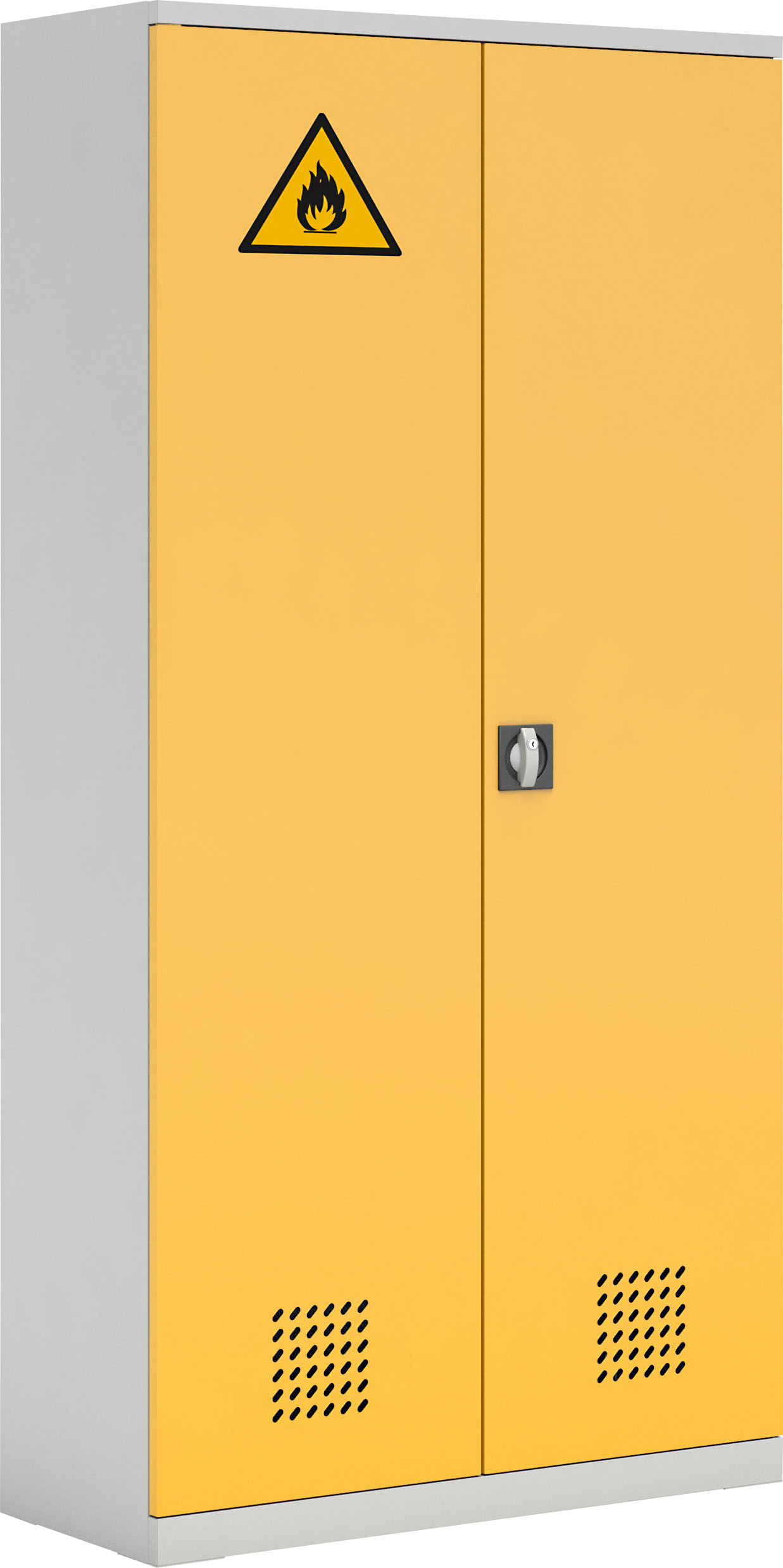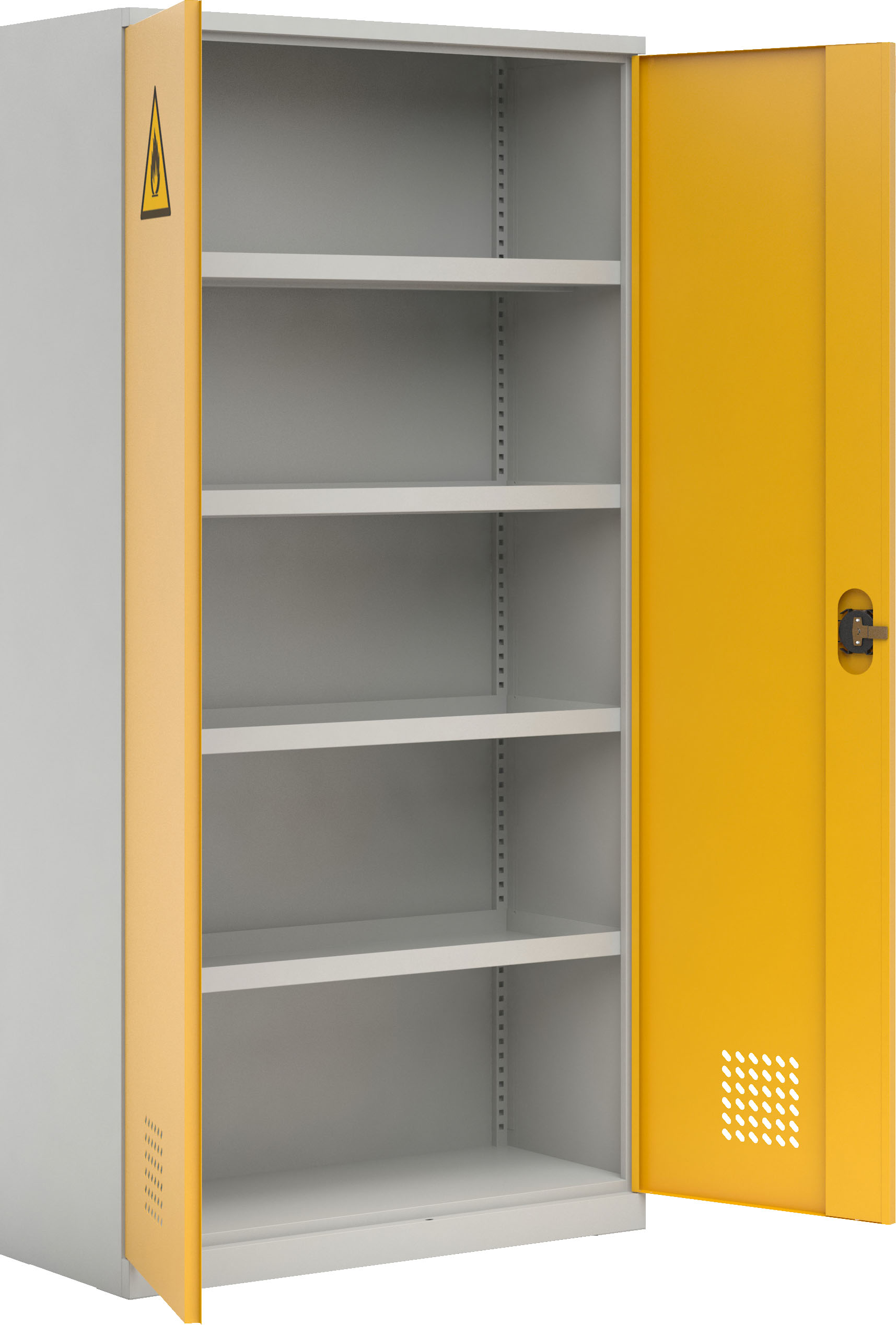 Aukšta cheminė spinta su cinkuotos skardos lentynomis, skirta cheminių reagentų ir degių medžiagų laikymui. Masyvios konstrukcijos spinta turi sustiprintas pilnas duris su 3 taškų užrakto sistema ir išoriniais vyriais. Duryse įrengtos oro įsiurbimo angos. Viduje – 4 perstatomos cinkuotos lentynos su apsauginiais kraštais, neleidžiančiais skysčiams išsilieti.