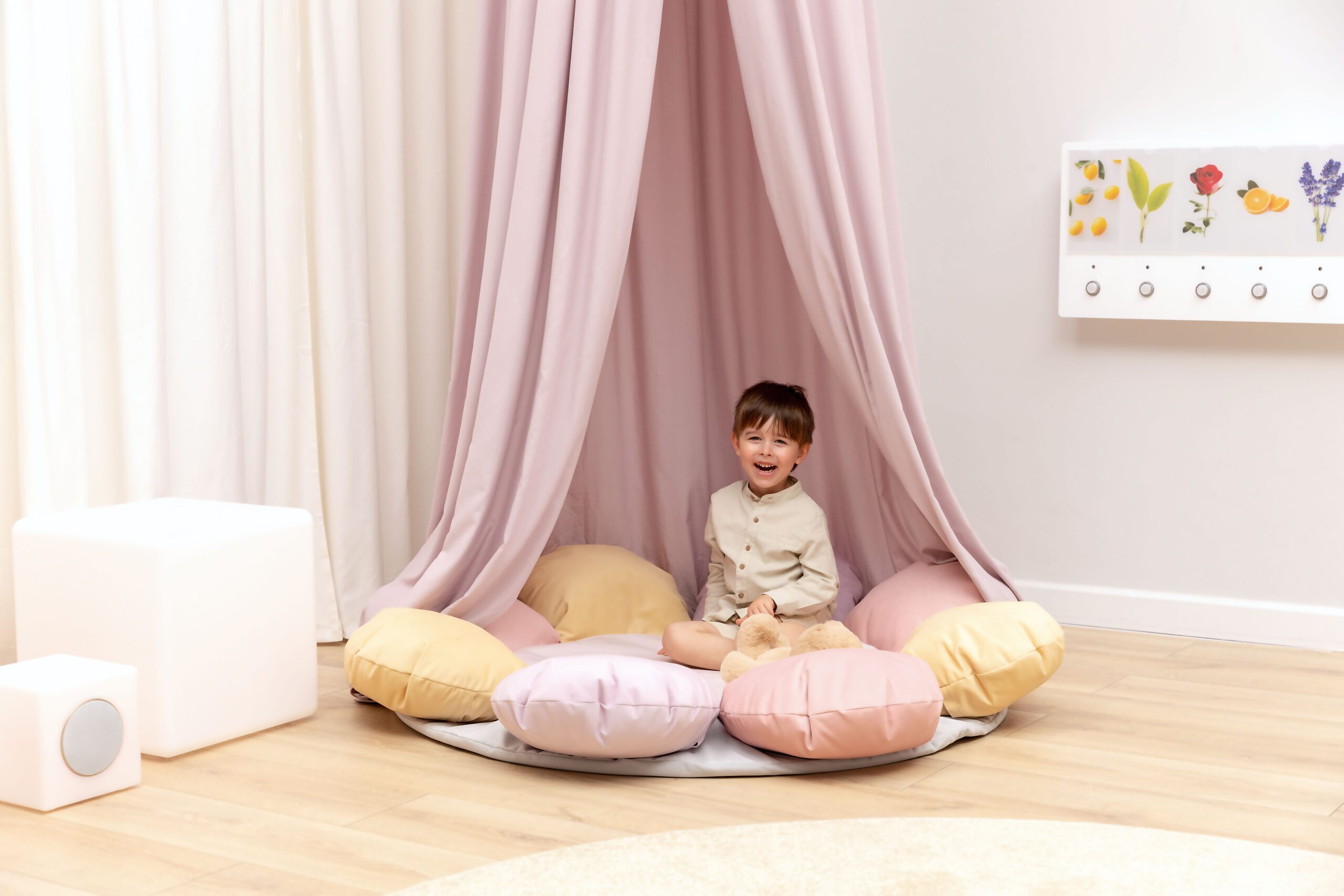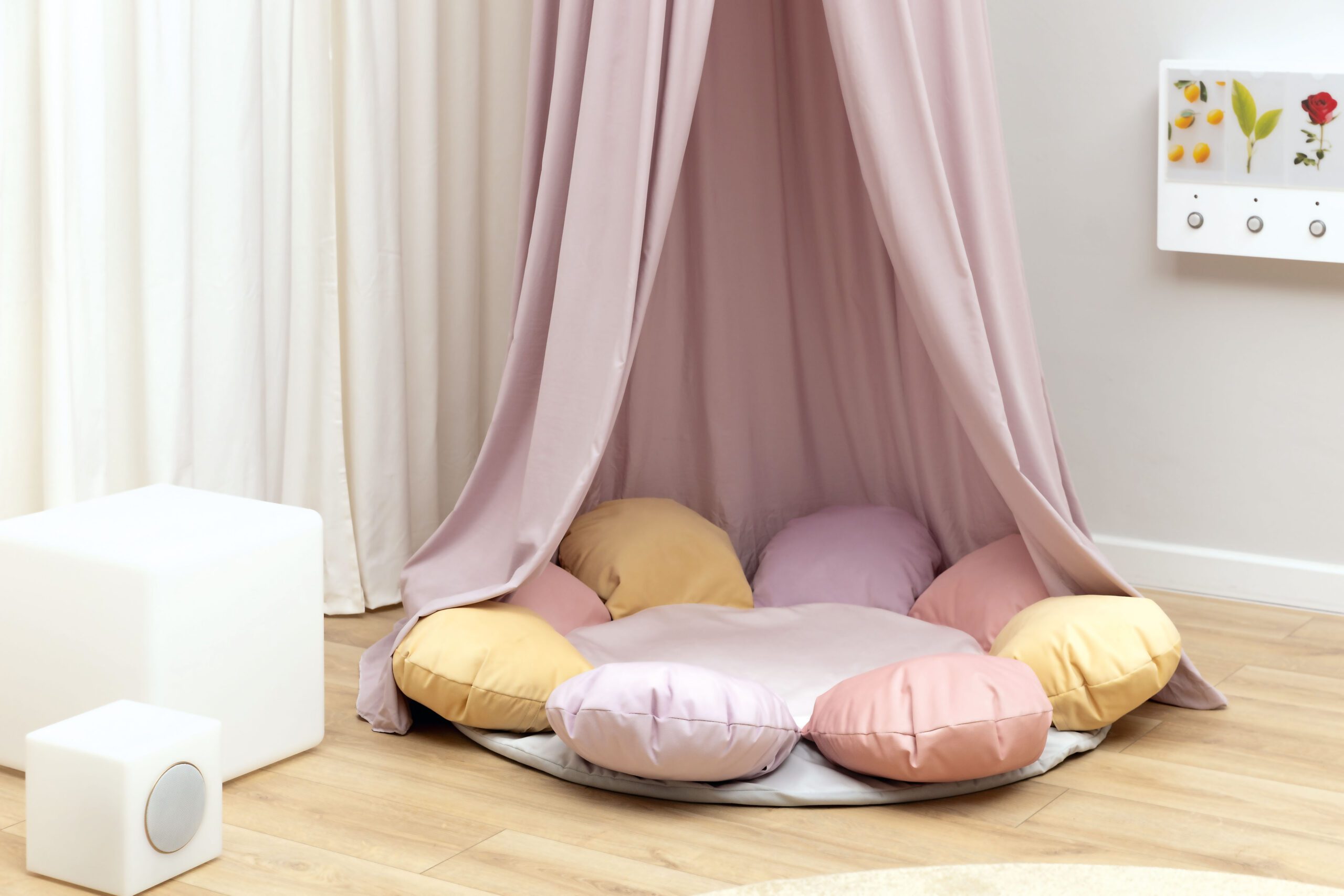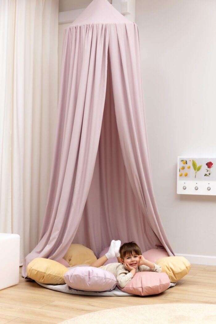 Pastelinės spalvos baldakimai yra universalūs dekoratyviniai elementai, idealiai tinkantys poilsio kampeliams. Pakabinti virš čiužinio, pagalvėlių ar sėdynių, jie sukuria jaukią erdvę, kurioje vaikai gali atsipalaiduoti, nusiraminti ir atsiriboti nuo išorinių dirgiklių.