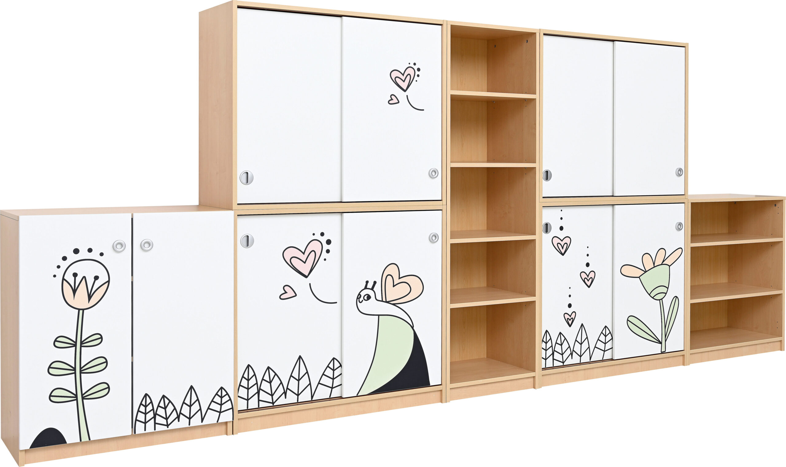 Baldai pagaminti iš 18 mm storio beržo atspalvių laminuotos plokštės, papildytos spausdintomis detalėmis.