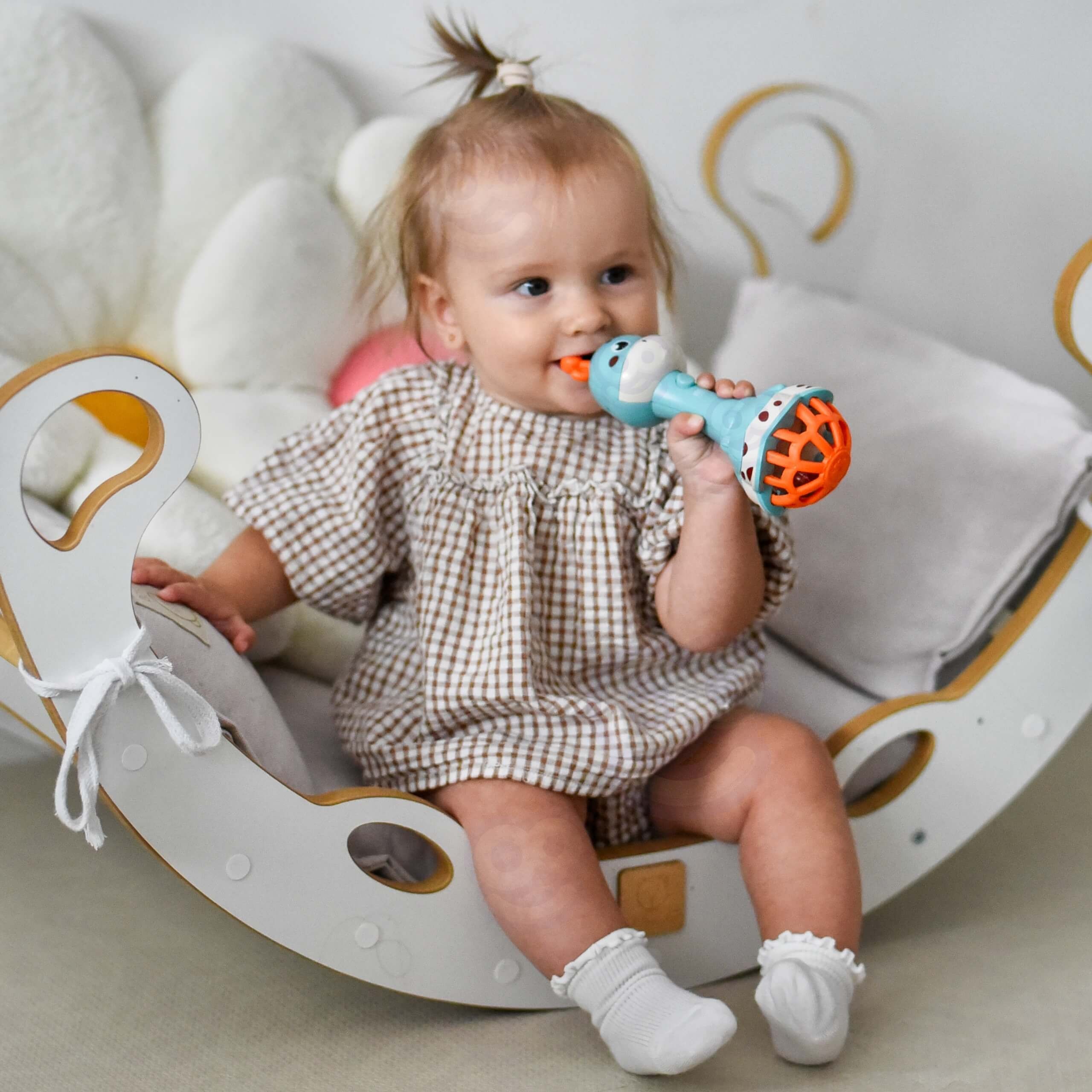 • – barškutis skleidžia švelnų garsą, todėl kūdikio klausos sistema nėra dirginama,