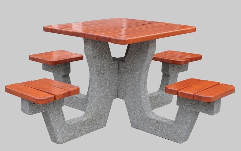 Betoninis–medinis poilsio stalas su impregnuotu ir lakuotu mediniu stalviršiu bei suoliukais. Stalo pagrindas pagamintas iš natūralių užpildų.