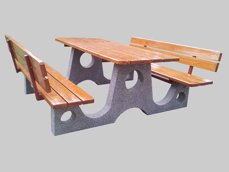 Betoninis-medinis poilsio (pikniko) stalas. Pagrindas pagamintas iš natūralių užpildų. Stalviršis ir sėdimosios vietos su atlošais – iš spygliuočių medienos, impregnuotos dviem sluoksniais lazūrinio lako ir dviem sluoksniais lako.