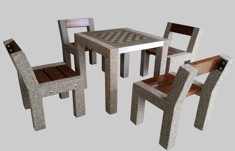 Žaidimų stalas su keturiomis kėdėmis, kėdės su atlošais. Betoninis ir medinis stalas šachmatams ar šaškėms. Stalo pagrindas pagamintas iš natūralių užpildų. Betoninis stalviršis su šachmatų ar šaškių lenta, šlifuotas ir poliruotas, impregnuotas. Stalviršis yra padengtas aliuminio profiliu. Sėdynės su atlošais yra pagamintos iš spygliuočių medienos, tinkamai įmirkytos ir padengtos dviem lako sluoksniais.