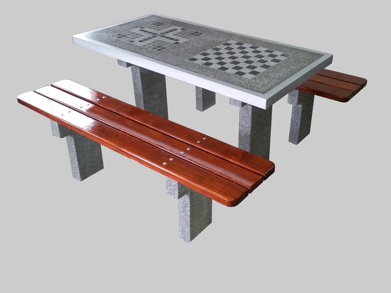 Betoninis-medinis stalas žaidimams šachmatais šaškėmis. Pagrindas pagamintas iš natūralių užpildų. Betoninis stalviršis su dviem žaidimų lentomis yra šlifuotas, poliruotas ir apsaugotas impregnantais. Kraštai apvesti aliuminio profiliu. Suoliukai pagaminti iš spygliuočių medienos, impregnuoti dviem sluoksniais lazūrinio lako ir dviem sluoksniais lako.