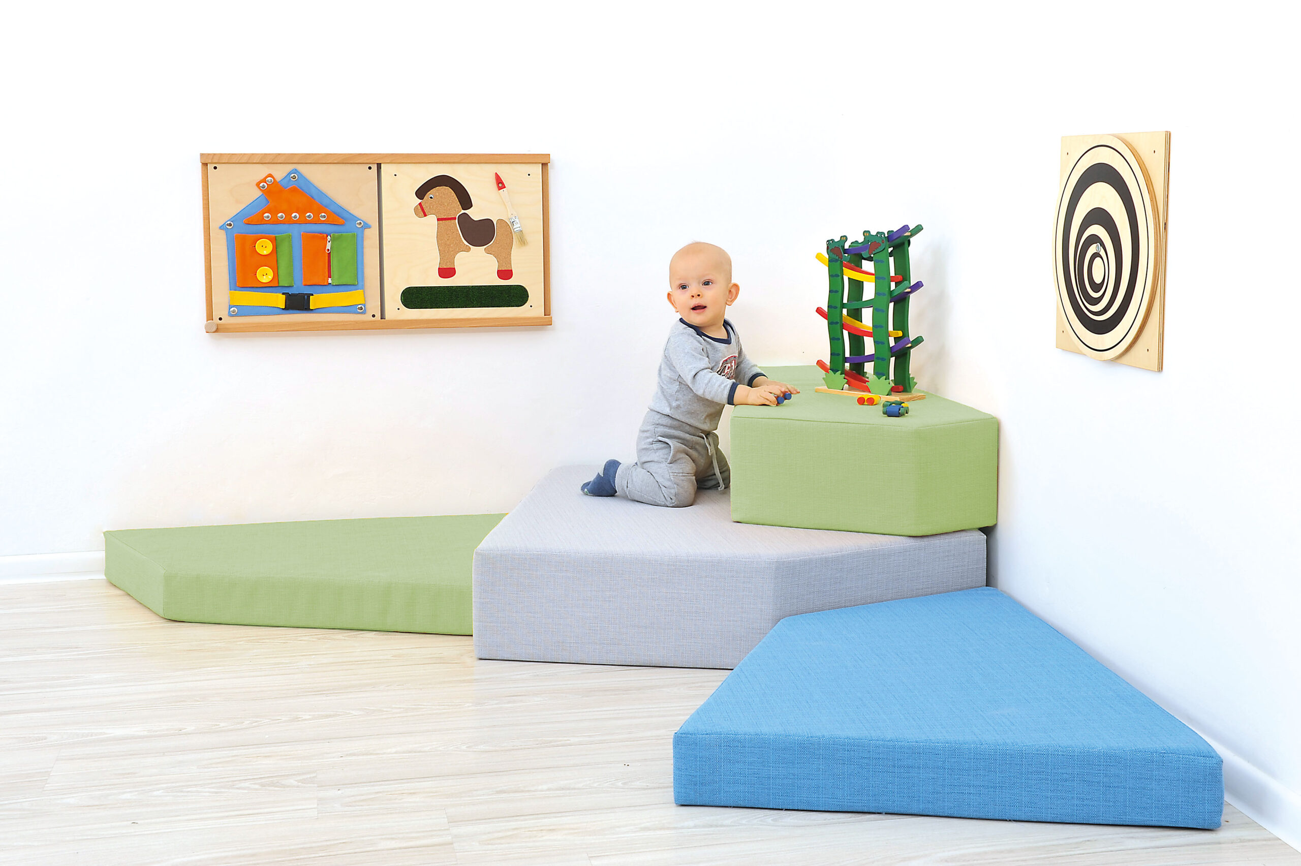 Quadro čiužinių rinkinys – puikus sprendimas vaikų žaidimų zonoms. Pagamintas iš putplasčio, aptrauktas aukštos kokybės itin patvariu nedegiu audiniu. Dėl labai didelio atsparumo dėmėms ir purvui idealiai tinka vaikų darželiams ir mokykloms. Audinio parametrai: 100 % poliesteris; svoris: 476 g/m; audinys atitinka DIN 4102-1 (B1 degumo klasė) ir EN-PN 1021-1; atsparumas dilimui: 96 000 ciklų.