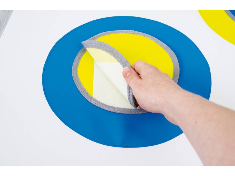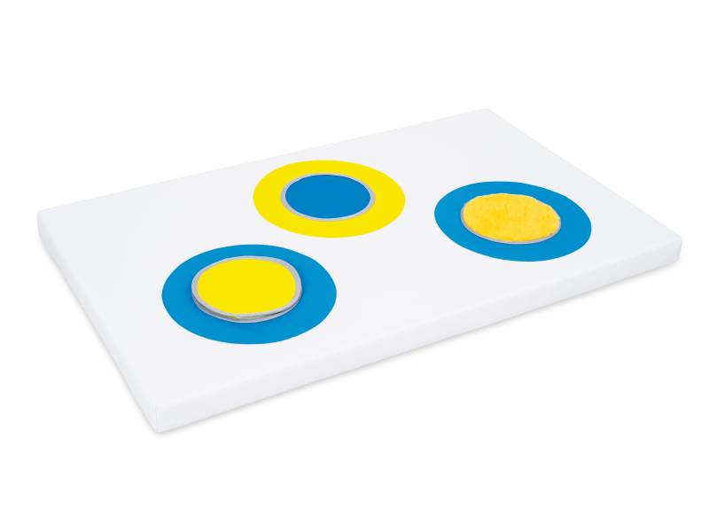 sensoriniai elementai: geltonas kailis, neslidus PVC audinys, Velcro aplikacija;