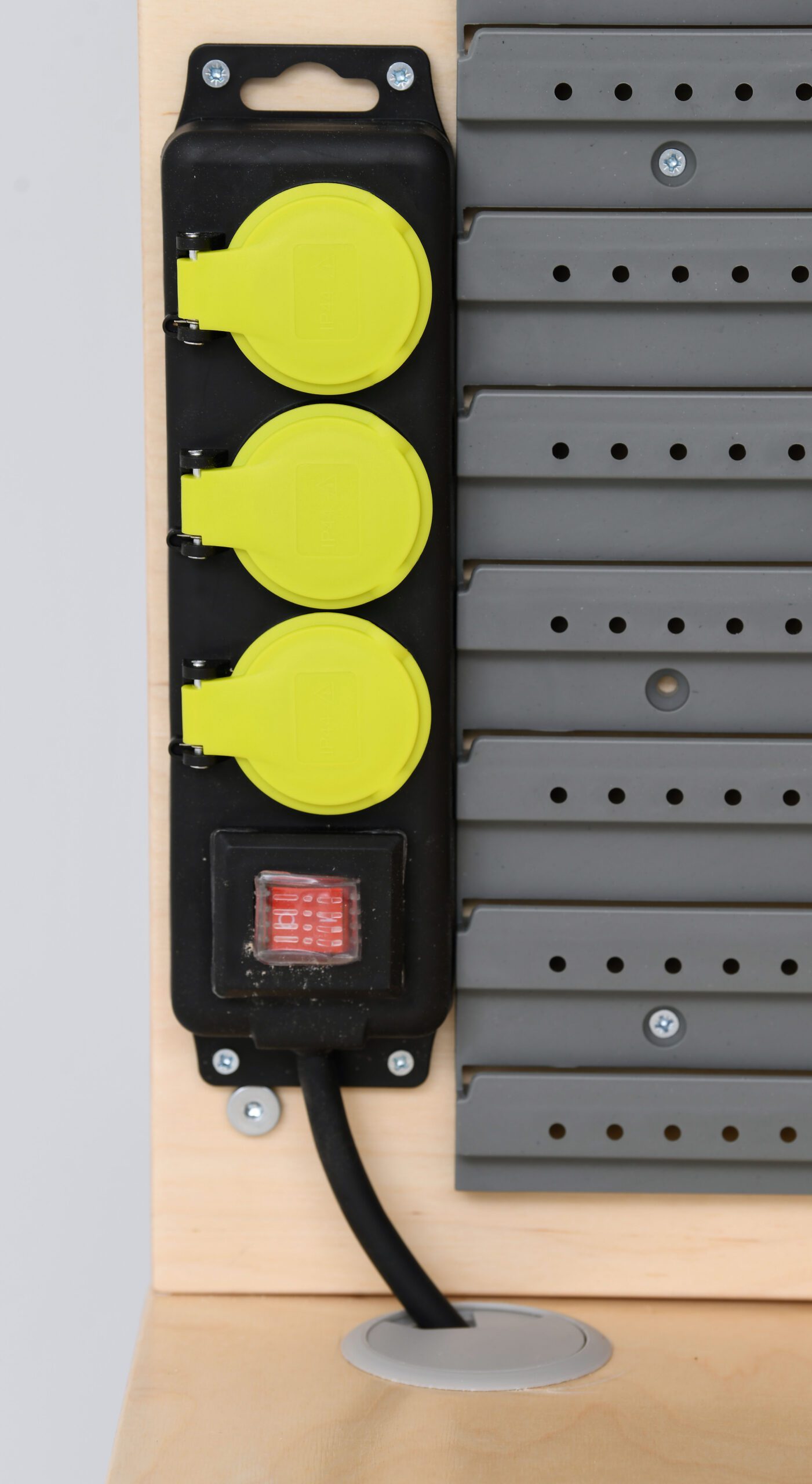 Tvirtas stalas iš faneros su dviem trigubais elektros lizdais. Aukštis reguliuojamas.