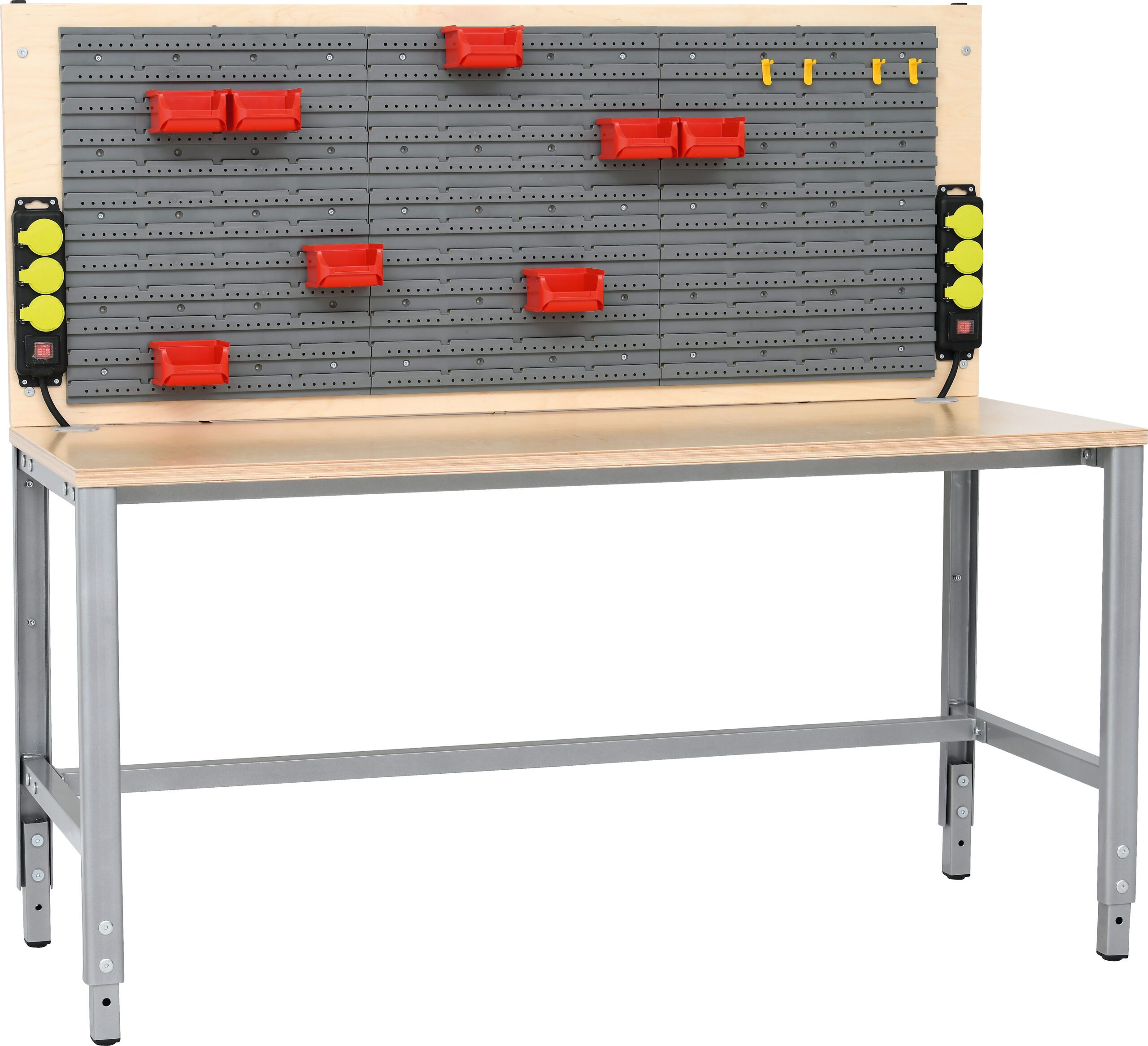 Darbastalis su sienele – tai tvirtas, profesionaliam naudojimui skirtas darbo stalas su papildoma įranga. Komplektą sudaro reguliuojamo aukščio darbastalis su elektros lizdais, antstalas su įrankių laikymo lenta, plastikiniai dėklai smulkiems daiktams ir kabliukų rinkinys.