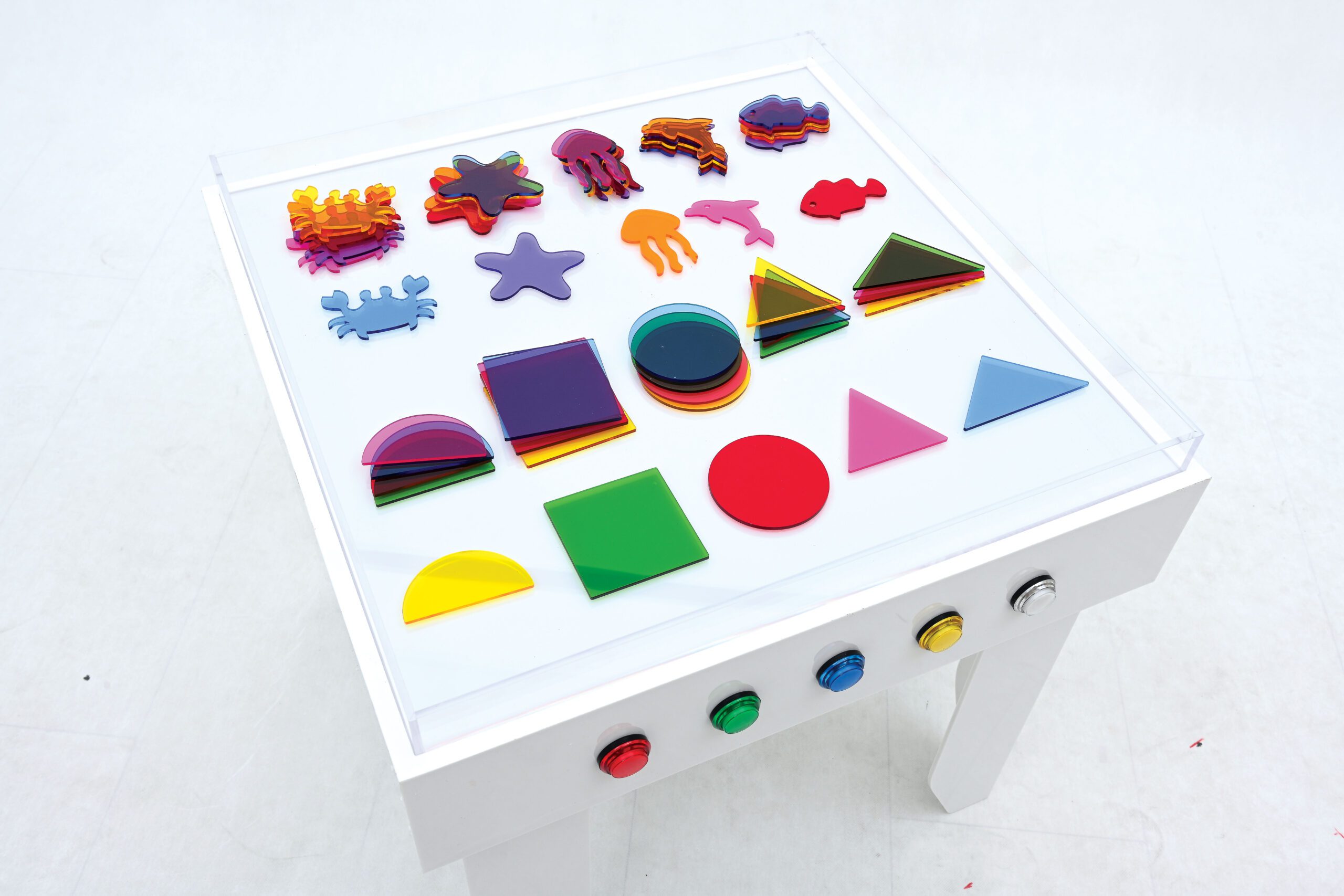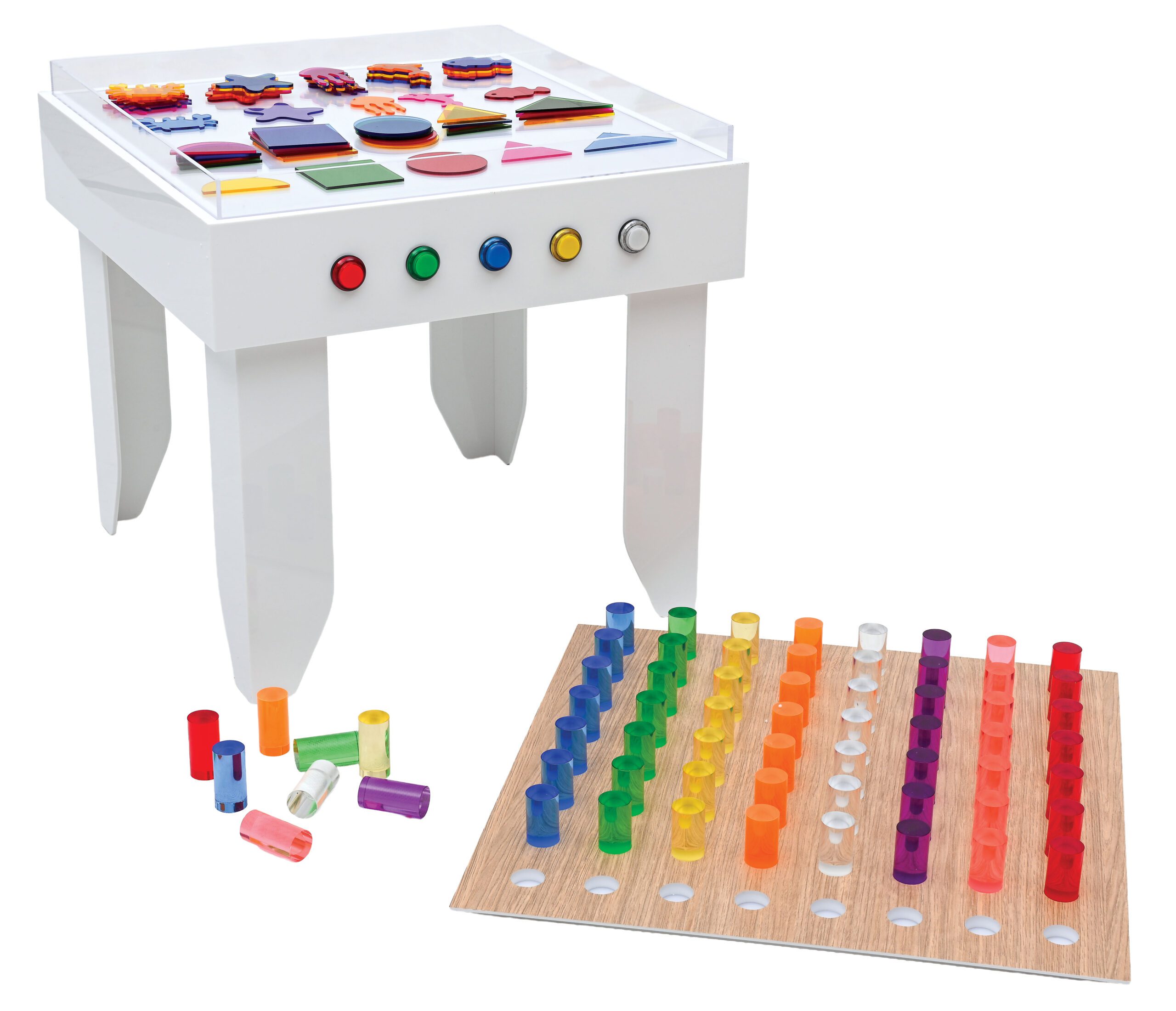 Jutiminis stalas su įmontuotu RGB LED apšvietimu yra puiki priemonė jutiminės integracijos terapijai, regos stimuliacijai ir atsipalaidavimui. Paviršius šviečia kintančiomis spalvomis, o tai pritraukia vaiko dėmesį ir skatina koncentraciją. Taip pat padeda ugdyti regos suvokimą ir objektų sekimą.