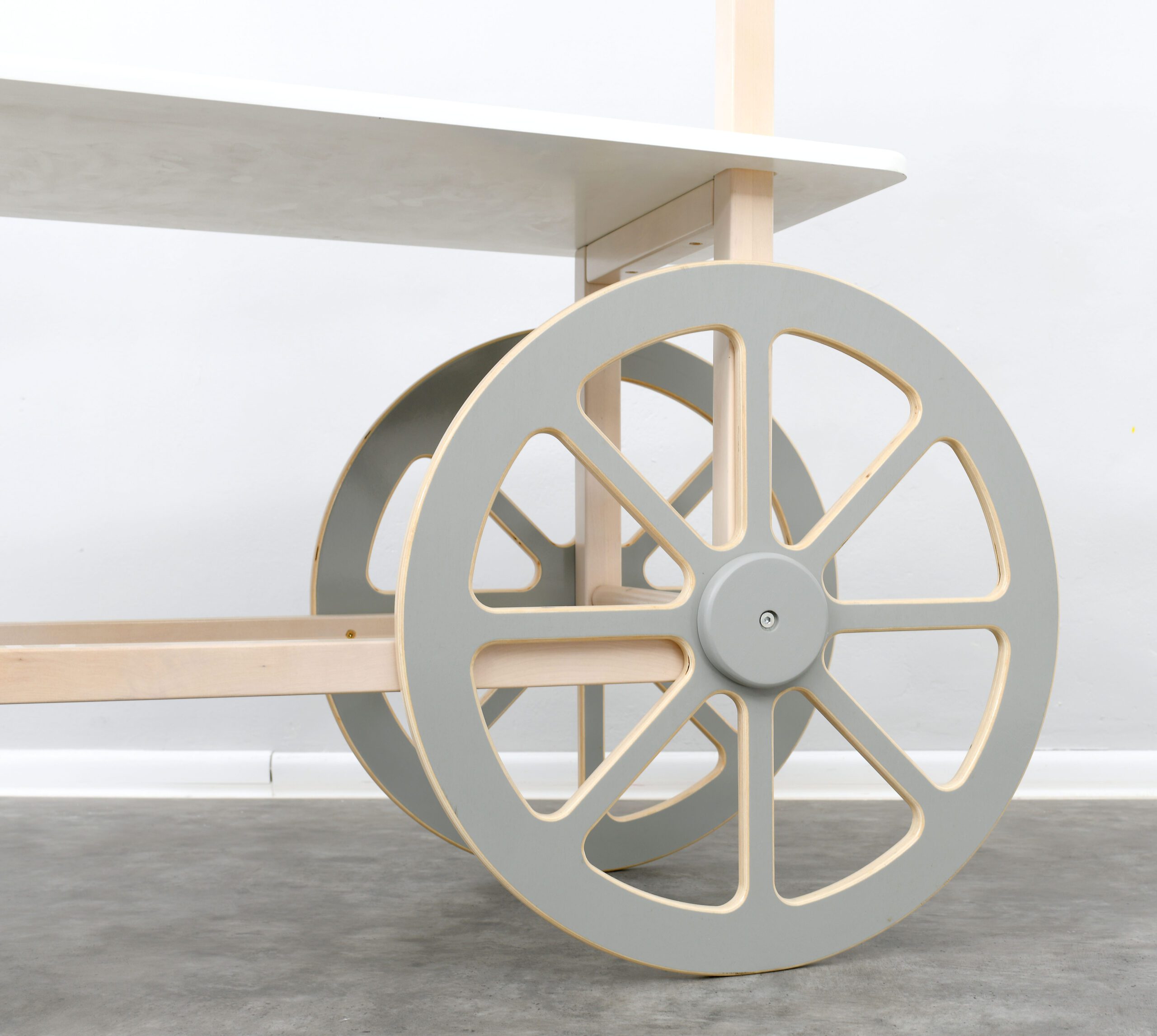 Kavinės kampelis suteikia daugybę galimybių smagiai žaisti vaidmenimis. Dėl kruopštaus pagaminimo ir įdomių spalvų jis taip pat taps estetiška kambario puošmena. Medžiaginis baldakimas. Medinis rėmas. Stogelio elementai ir ratukai 53 cm skersmens, pagaminti iš lakuotos 18 mm storio faneros. Stalviršis pagamintas iš baltos foliuotos MDF plokštės, 16 mm storio. Stalas su šlifuojamu paviršiumi, kurio matmenys 40 x 25 cm, pagamintas iš raudonos MDF plokštės, 12 mm storio. – Stalo stalviršis, kurio matmenys 118 x 48 cm, 61,5 cm aukštyje.