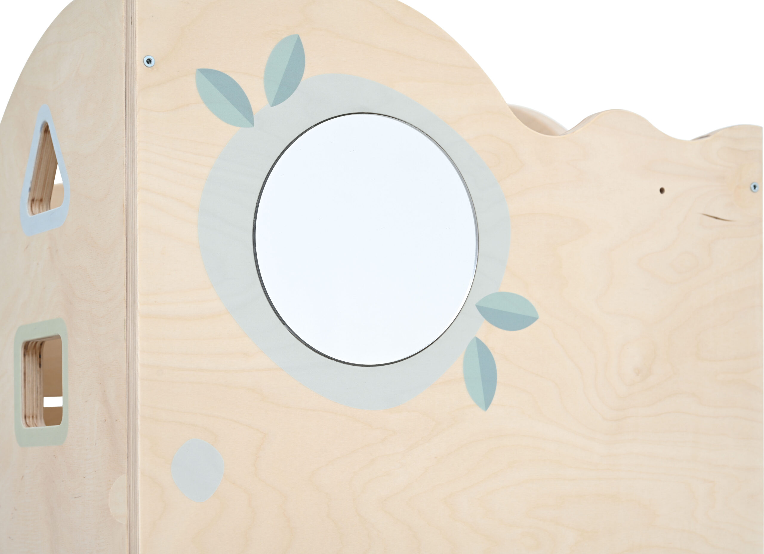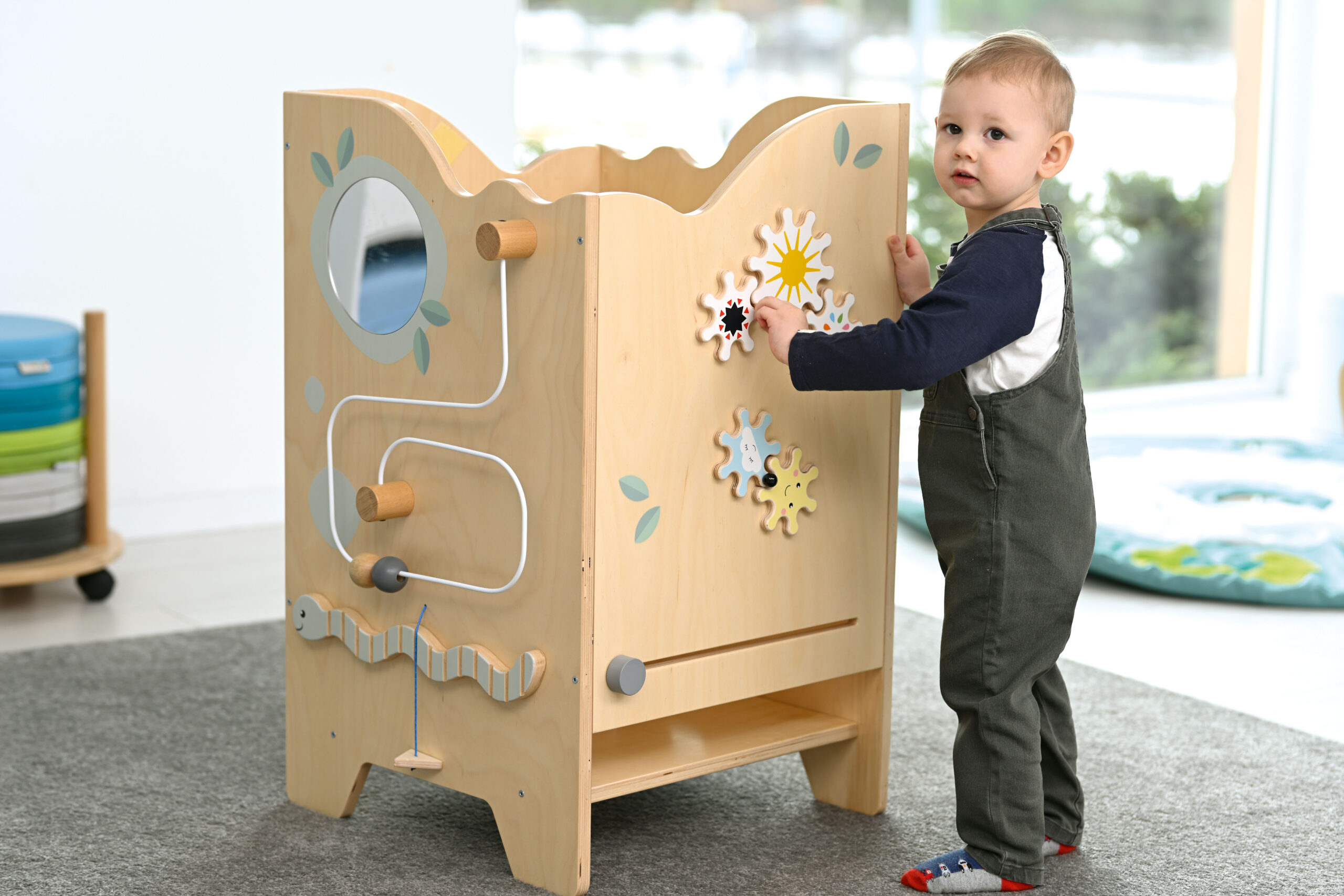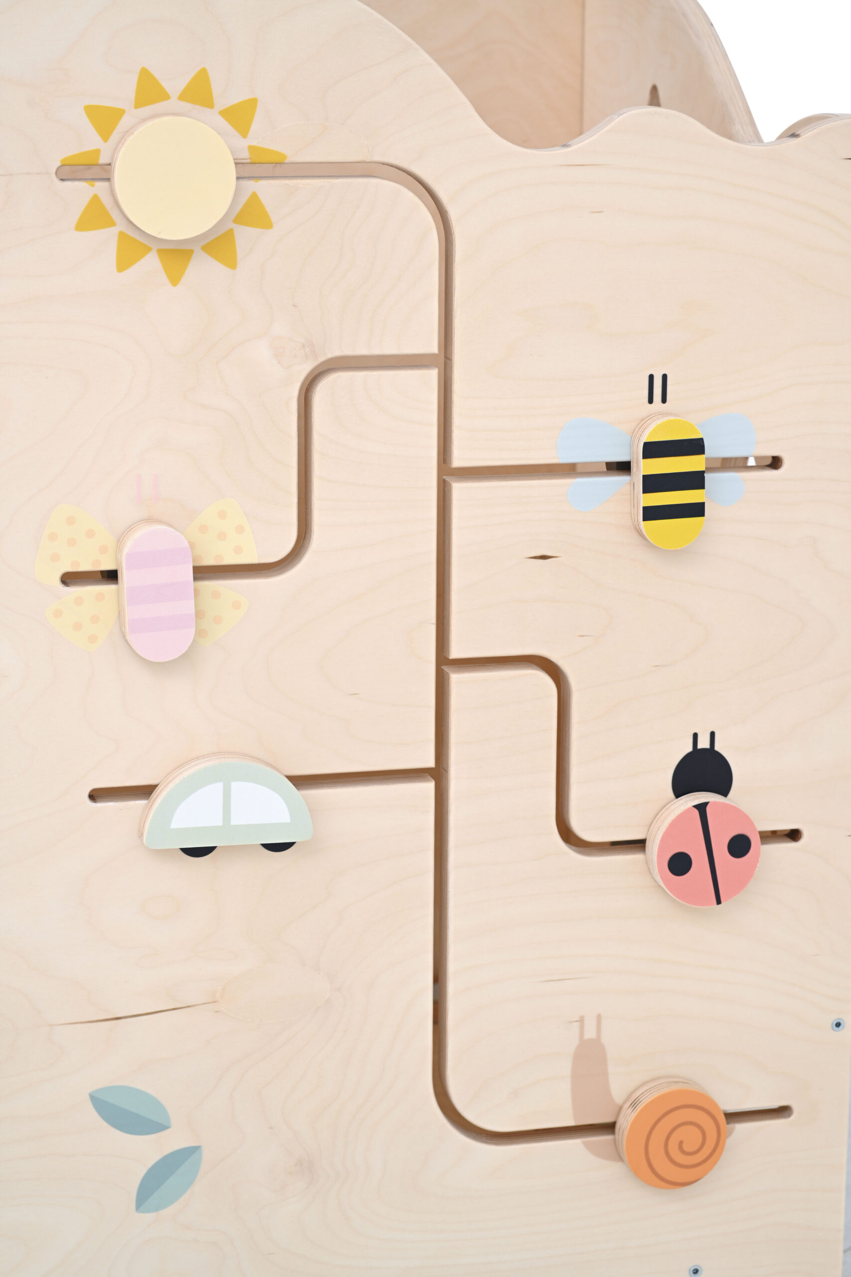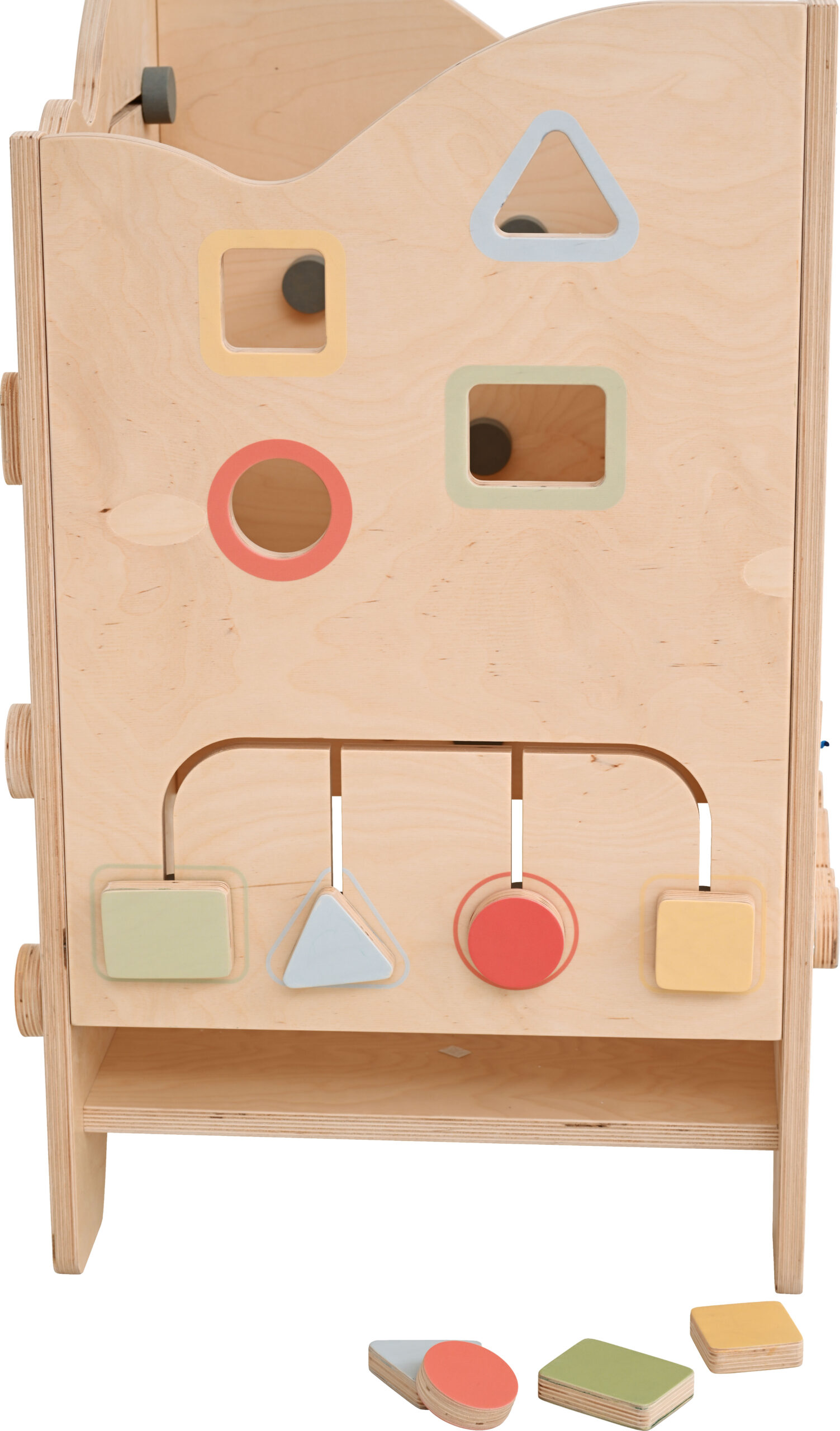 Pagaminta iš 18 mm storio faneros. Vienu metu gali žaisti 4 vaikai. Įrengtas apsauginis veidrodis, 3 slankmačiai, krumpliaračiai ir geometrinių figūrų rūšiuoklė.