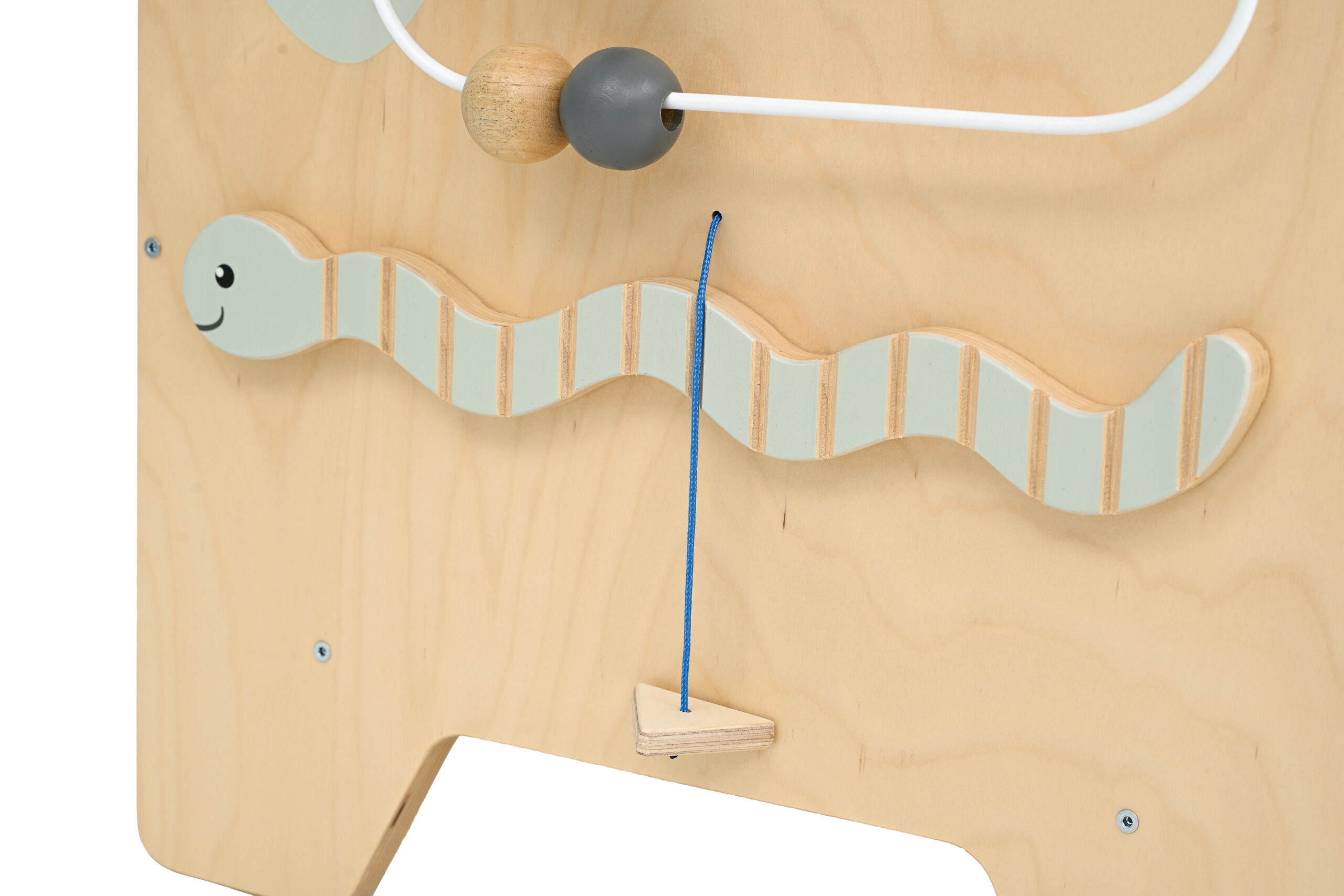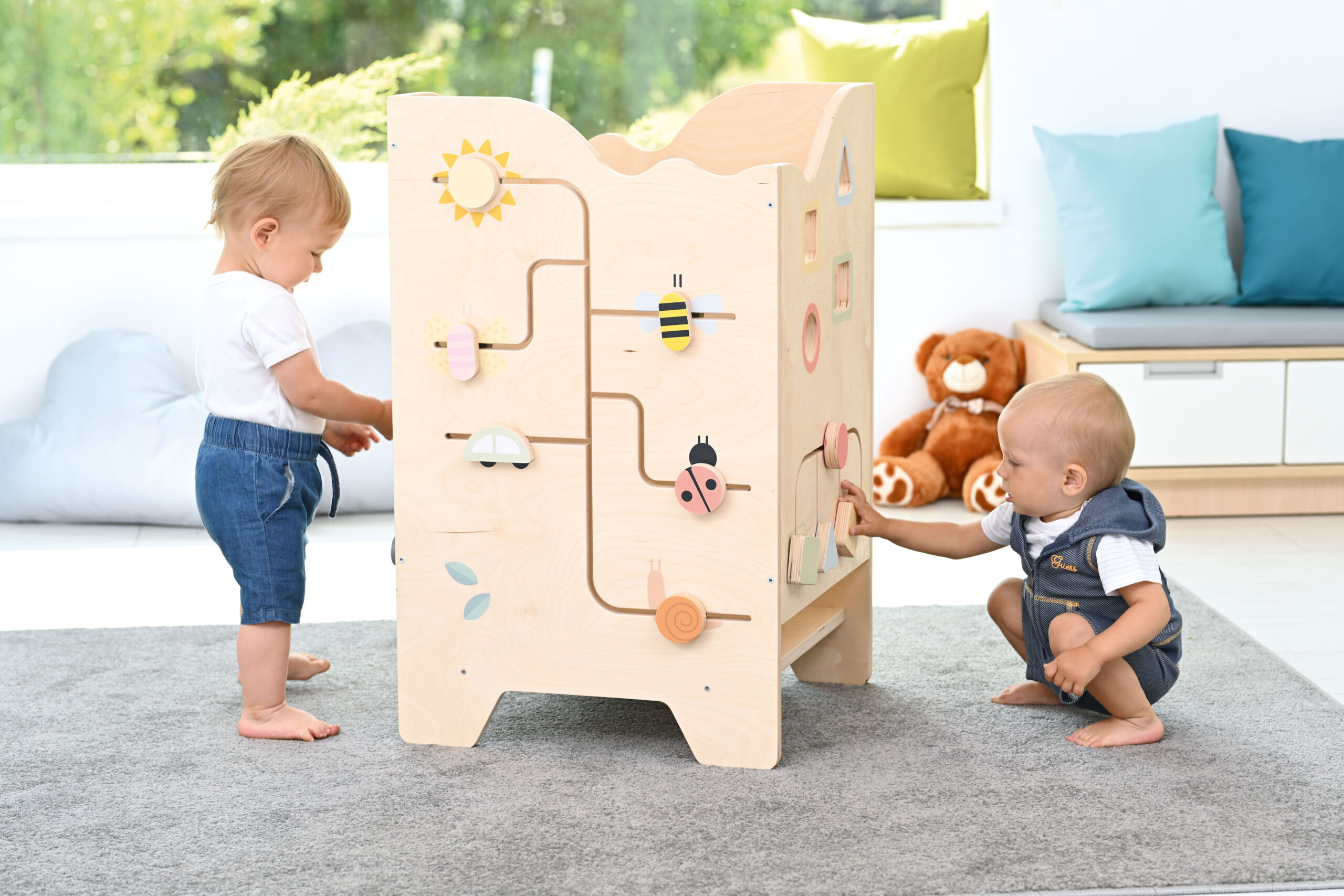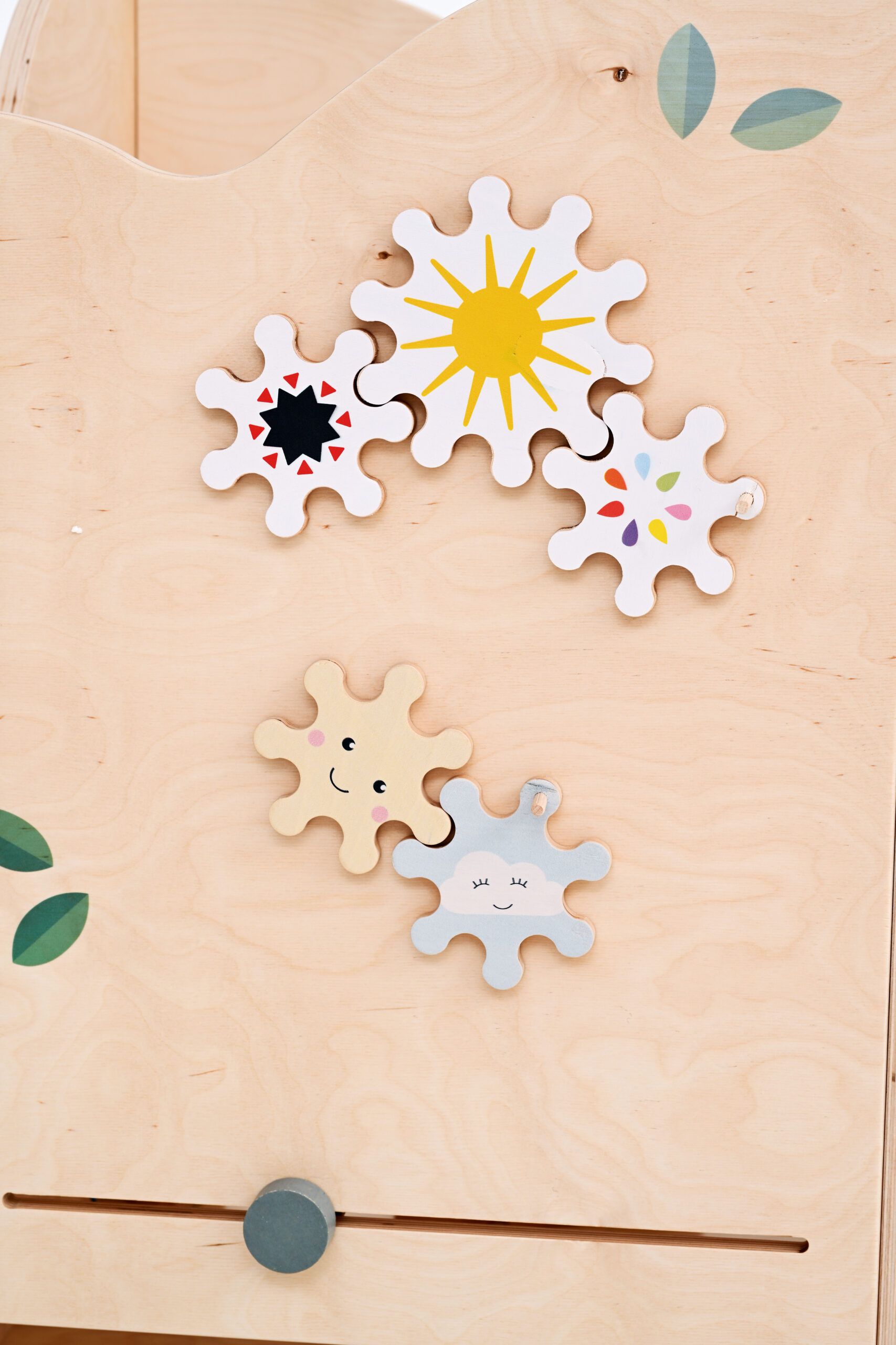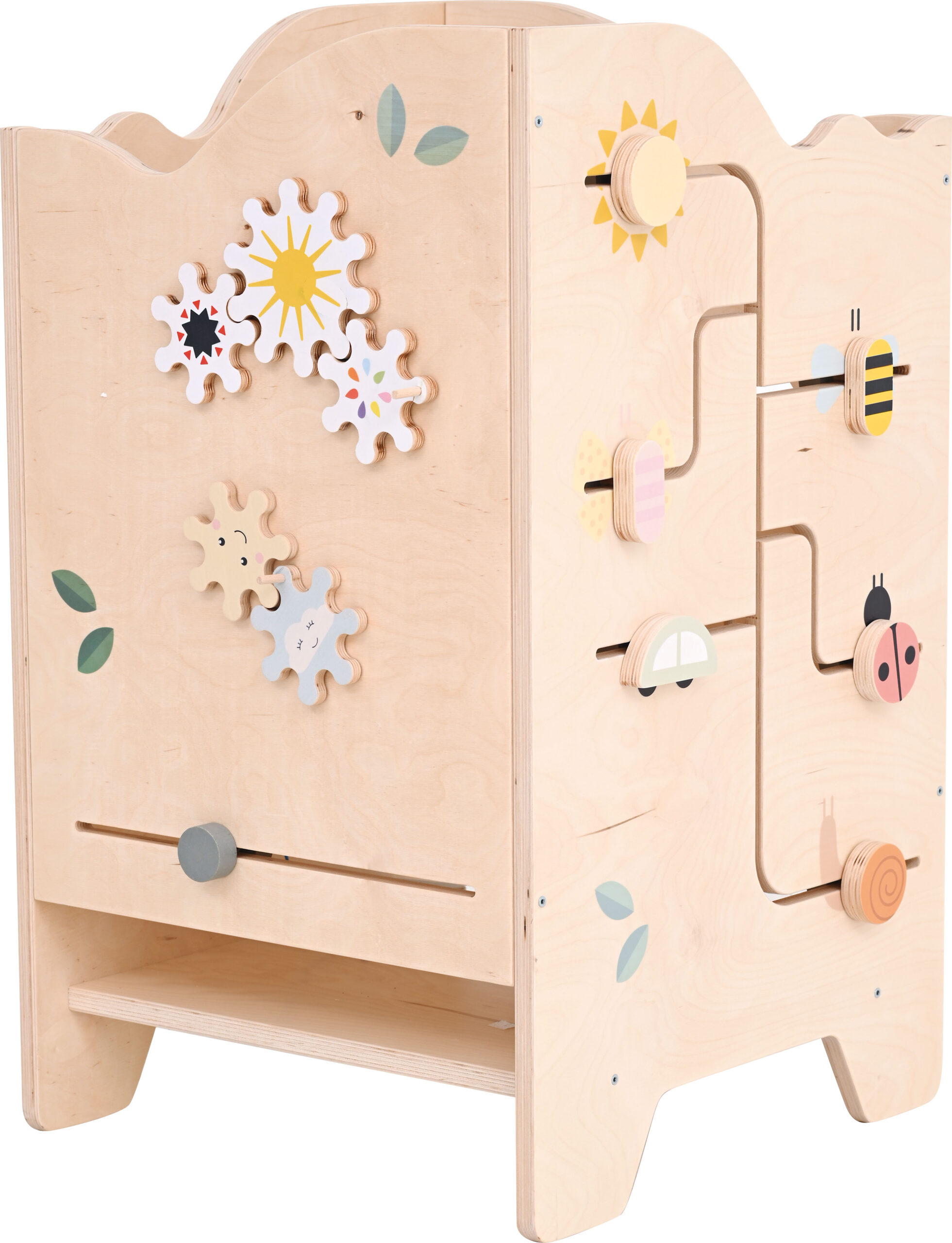 Pagaminta iš 18 mm storio faneros. Vienu metu gali žaisti 4 vaikai. Įrengtas apsauginis veidrodis, 3 slankmačiai, krumpliaračiai ir geometrinių figūrų rūšiuoklė.