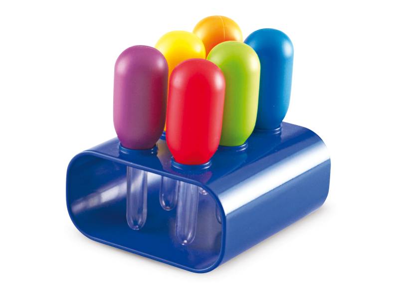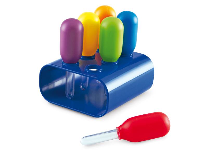Didelės spalvotos pipetės skirtos mažoms rankoms. Jomis galima atlikti pirmuosius stebėjimus ir eksperimentus, susijusius su tūriu, priežastimis ir pasekmėmis.