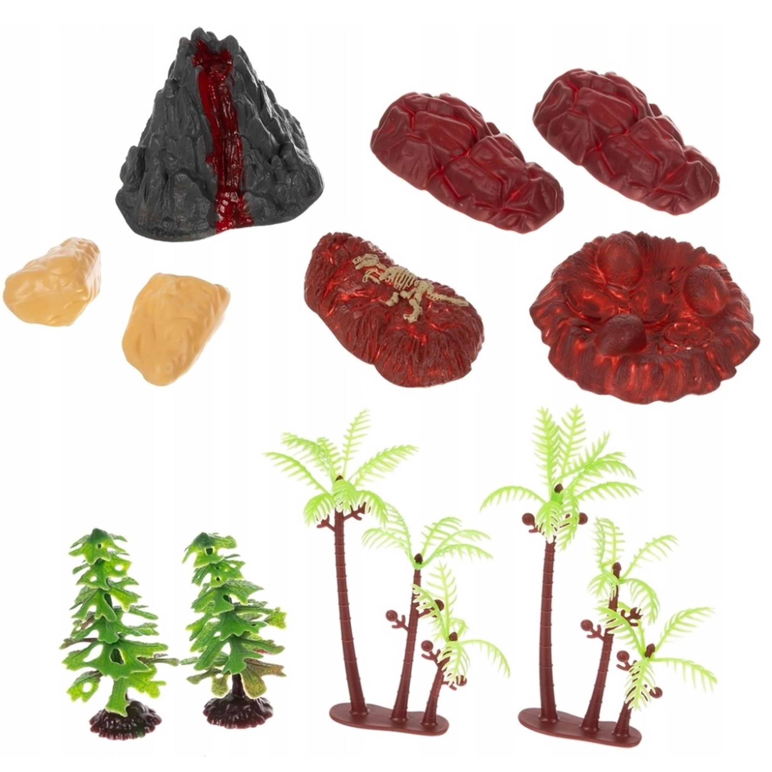 – 12 dinozaurų figūrų – Tyrannosaurus Rex, Ankylosaurus, Dilophosaurus, Triceratops, Lesothosaurus, Brontosaurus, 2x Spinosaurus, Tarbosaurus, Iguanodon, Pieranodon – Didelis žaidimų kilimėlis – dinozaurų parkas – 4 medžių figūrėlės – 7 kitos figūrės – lava, lizdas su dinozaurų kiaušiniais, akmenys
