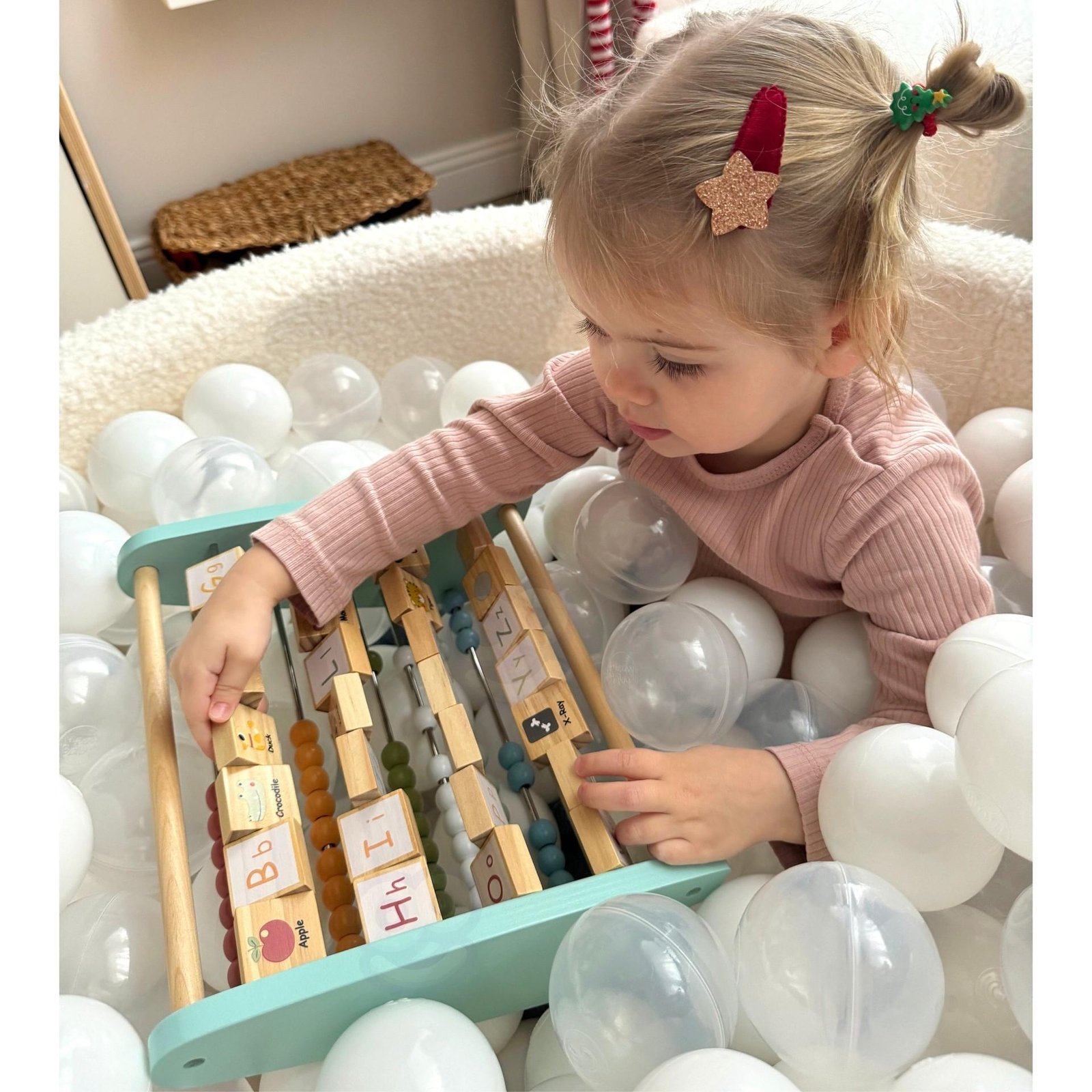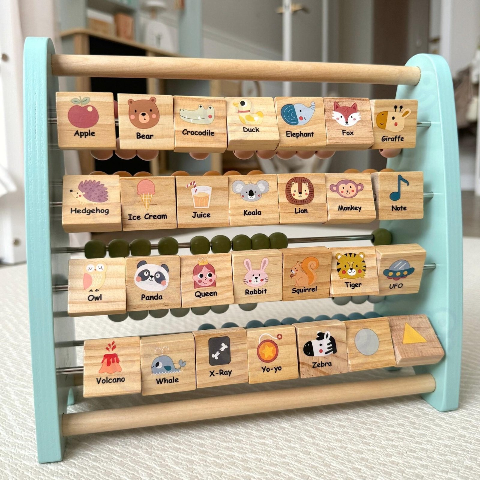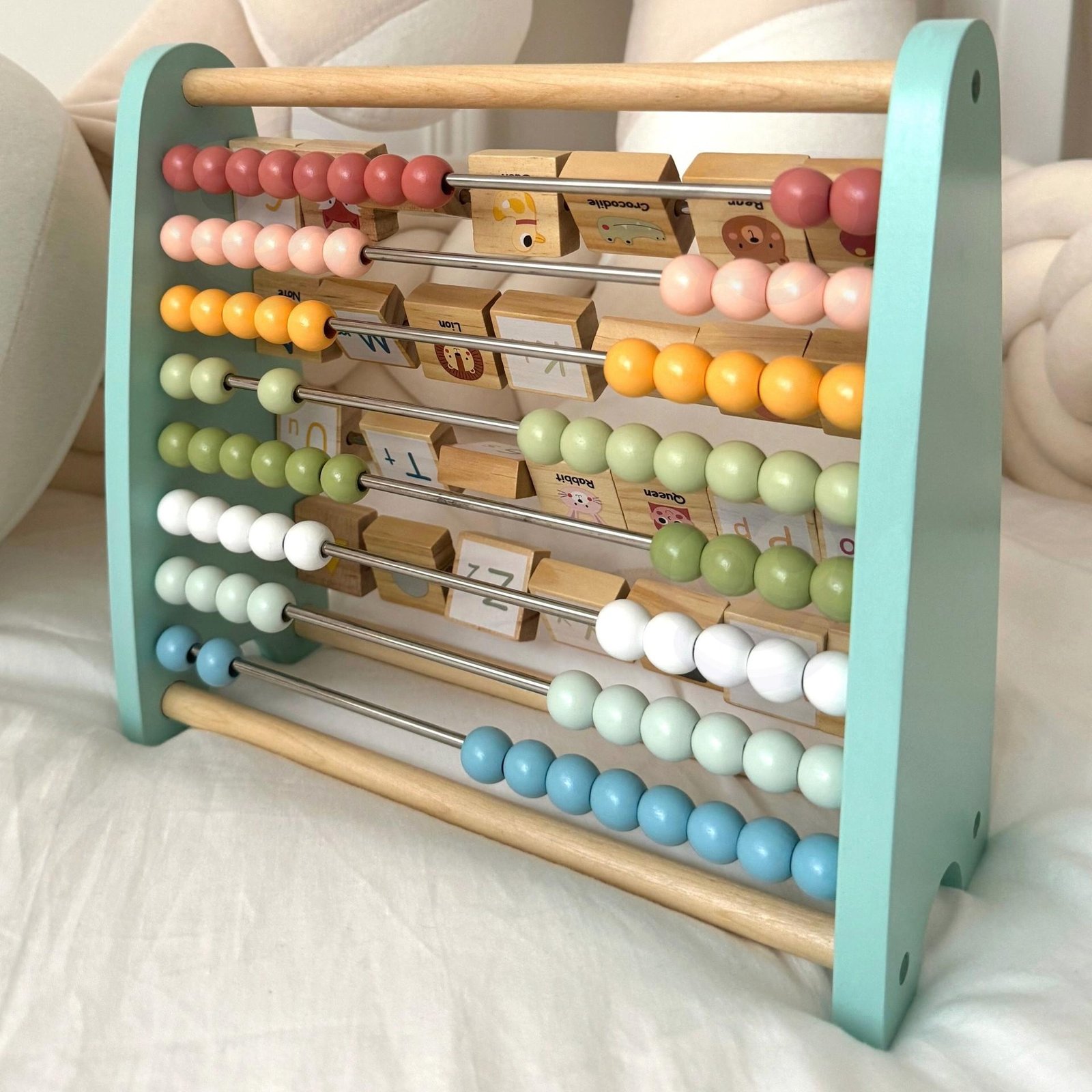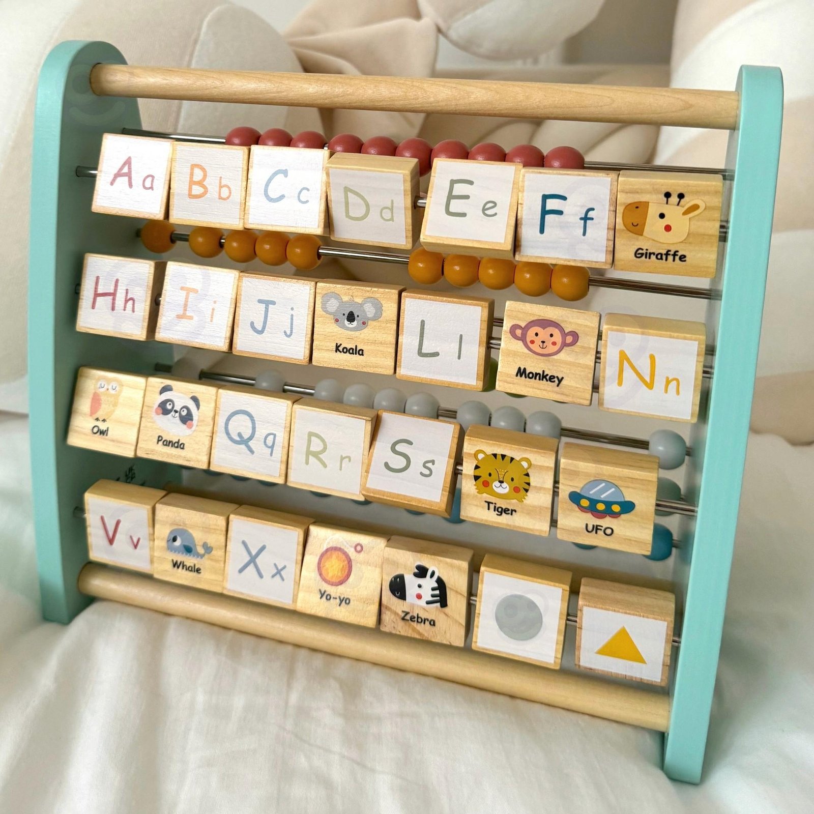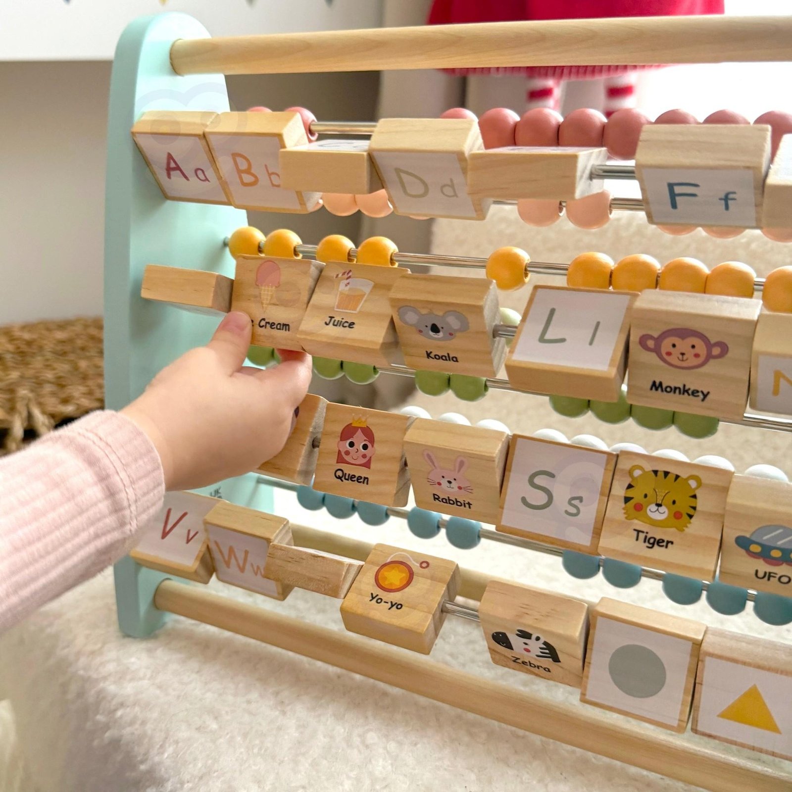 Vienoje pusėje vaikai gali atrasti amžiną klasikinių karoliukų skaitliuko žavesį idealų pagrindinių skaičiavimo įgūdžių ir matematikos koncepcijų vystymui. Kitoje pusėje laukia unikali staigmena – abėcėlės abakas, kurio blokai turi didžiąsias ir mažąsias abėcėlės raides. Kiekvienas blokas turi paveikslėlį, susijusį su tam tikra raide, todėl mokymasis tampa įdomus ir linksmas.