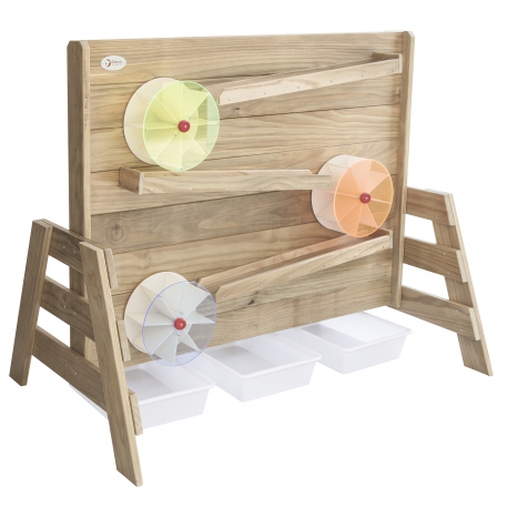 „Classic World“ medinė sienelė „Water Play“ yra puikus žaidimų aikštelės papildymas. Gaminys pagamintas iš aukštos kokybės medienos, nudažytas netoksišku impregnantu, kuris yra visiškai saugus vaikams. Supilkite smėlį ant medinės lentynėlės ir stebėkite, kaip jis barstomas žemyn, o tai privers malūnėlį suktis. Kitoje sienelės pusėje yra tuneliai, į kuriuos galima pilti vandenį. Žaidimas veiks kaip mokomoji veikla, padedanti išjudinti ir išjudinti malūnėlį.