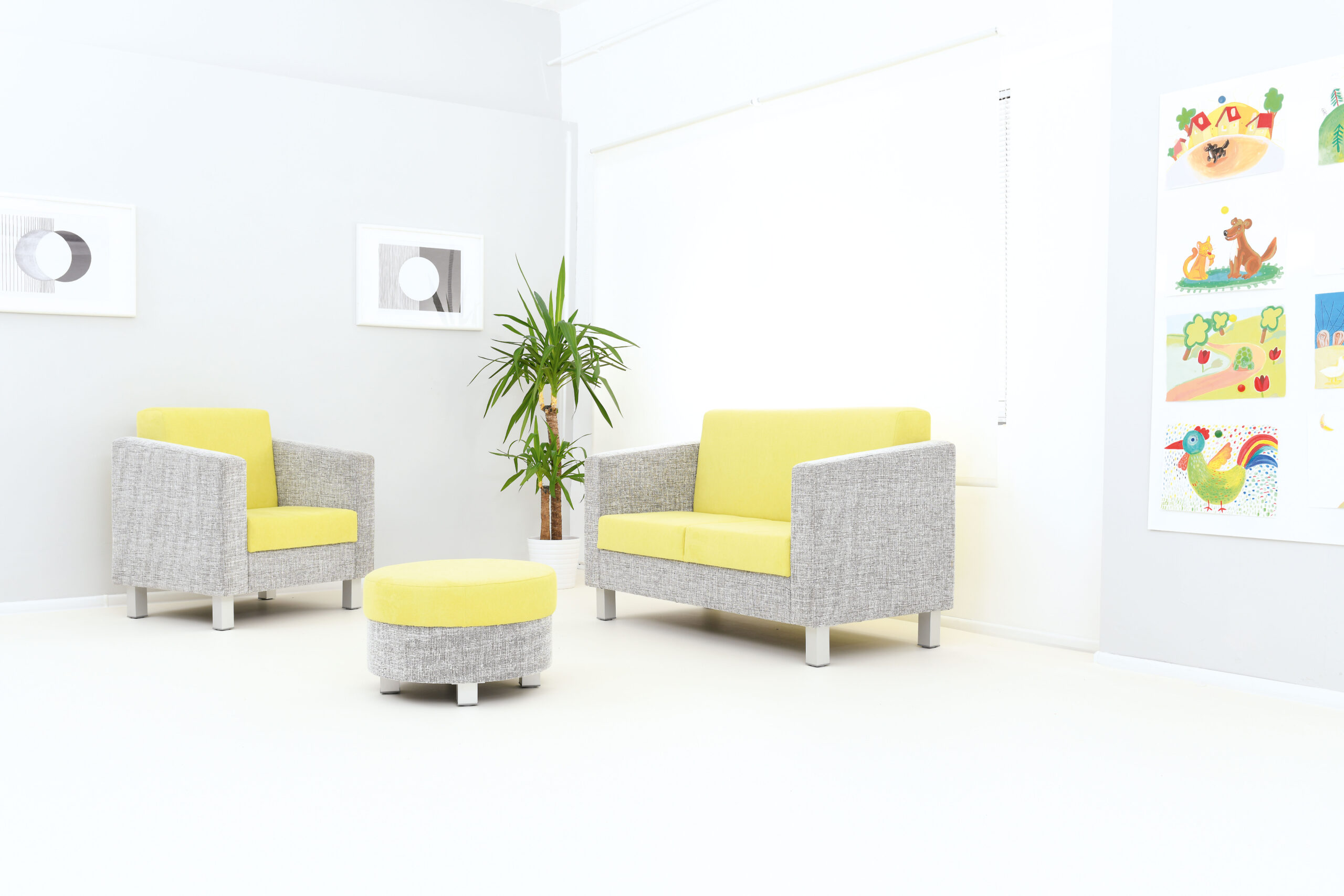 Baldai aptraukti estetišku ir maloniu liesti audiniu. Galima rinktis ant apvalių arba kvadratinių aliuminio kojų su plastikiniais kojų galais. Kojų galai nuimami, todėl baldo aukštį galima padidinti maždaug 3,5 cm.