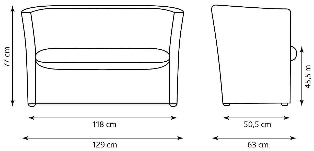 • bendrieji matmenys: 118 x 63 x 77 cm • sėdynės aukštis: 45,5 cm • sėdynės gylis: 50,5 cm.