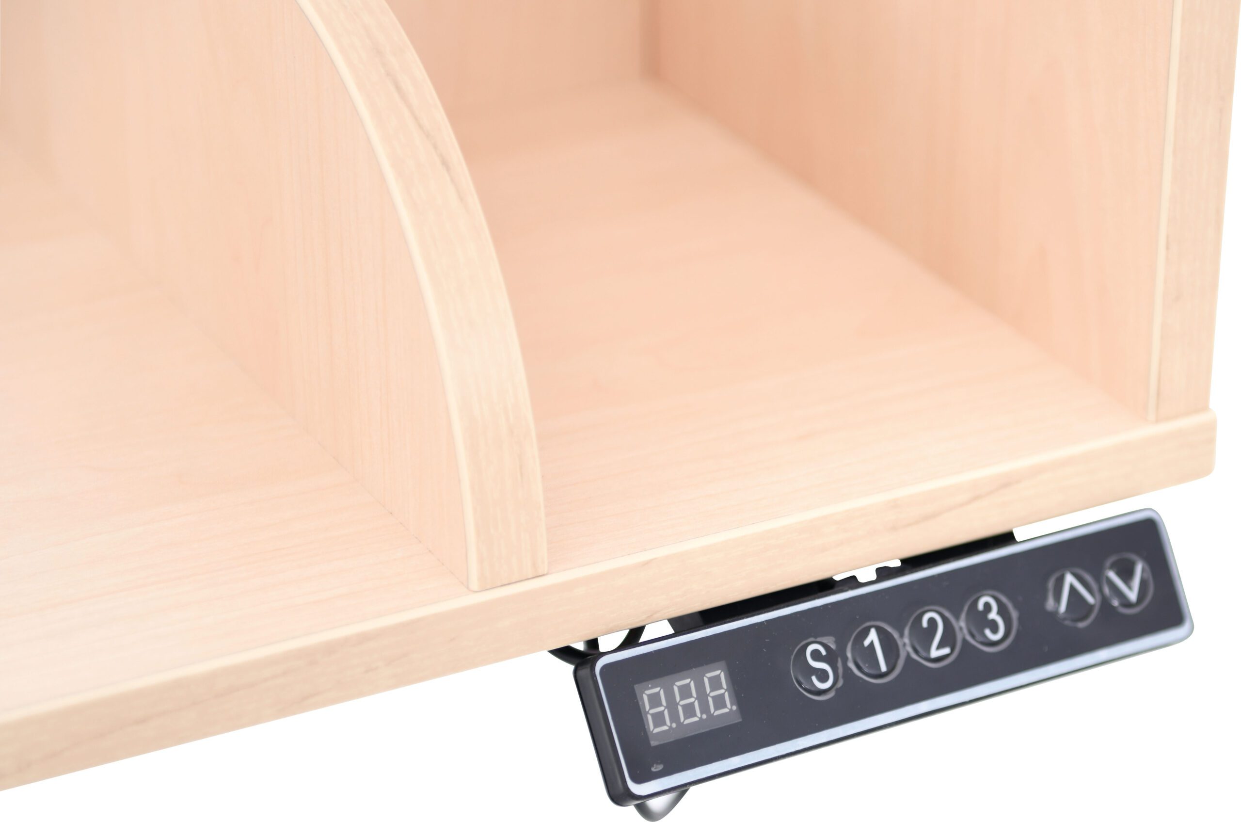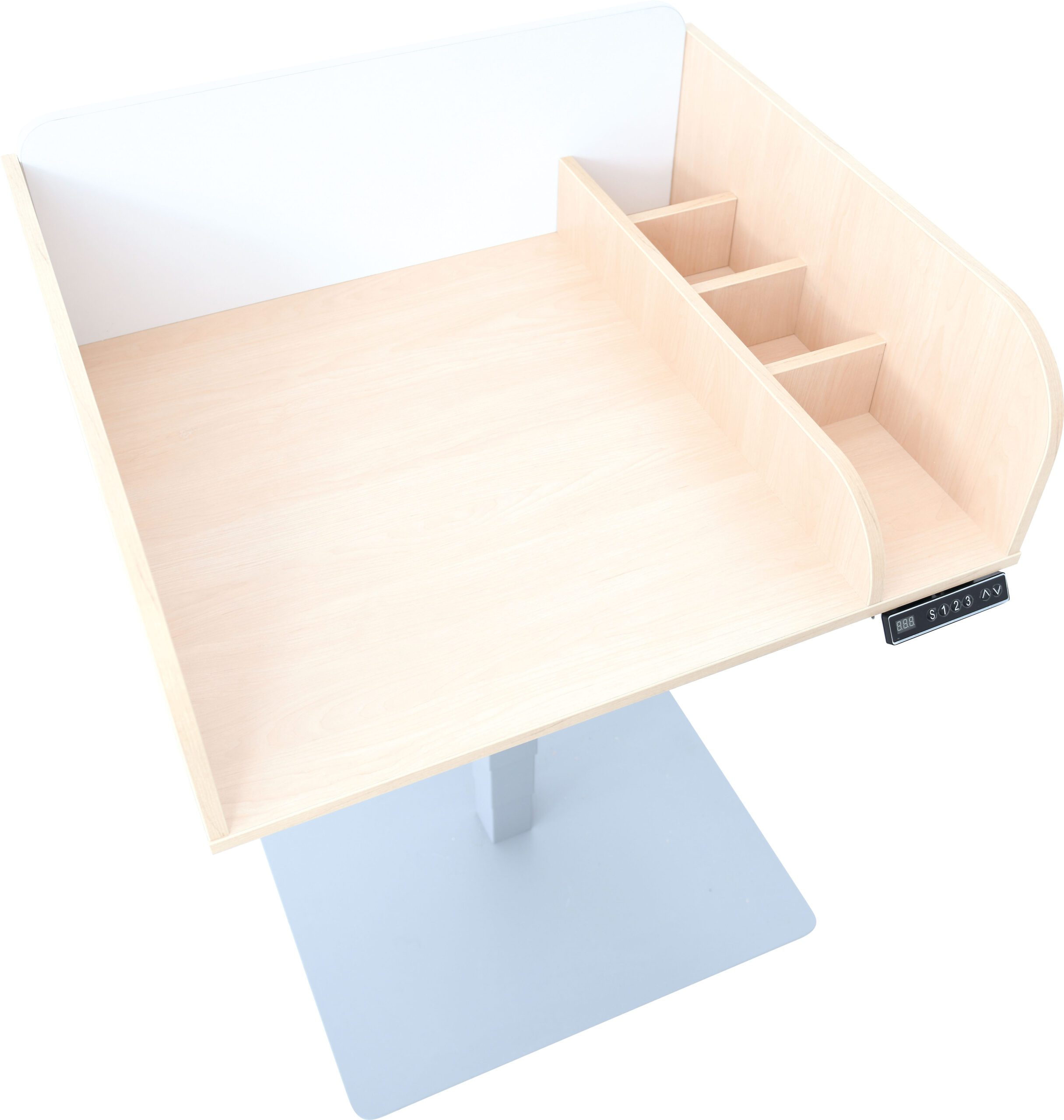 Funkcionalus stalas su aukščio reguliavimu. Pagamintas iš laminuotos medžio drožlių plokštės, klevų ir baltos spalvos, ant tvirtos, kvadratinės kojos su sklandžiu elektriniu aukščio reguliavimu.
