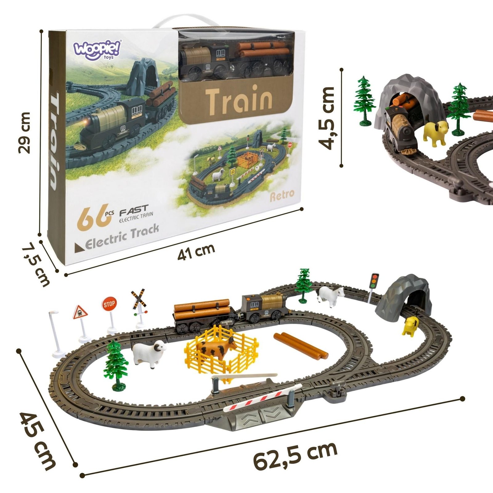 Elektrinis traukinio rinkinys (66 dalys) – baterijomis varomas lokomotyvas su šviesa, judantis pirmyn ir atgal, su trasomis, krypties keitimo svirtimis ir dekoratyviniais elementais. Komplektas skatina kūrybiškumą, lavina vaizduotę, techninį mąstymą, erdvinį suvokimą bei rankų ir akių koordinaciją.