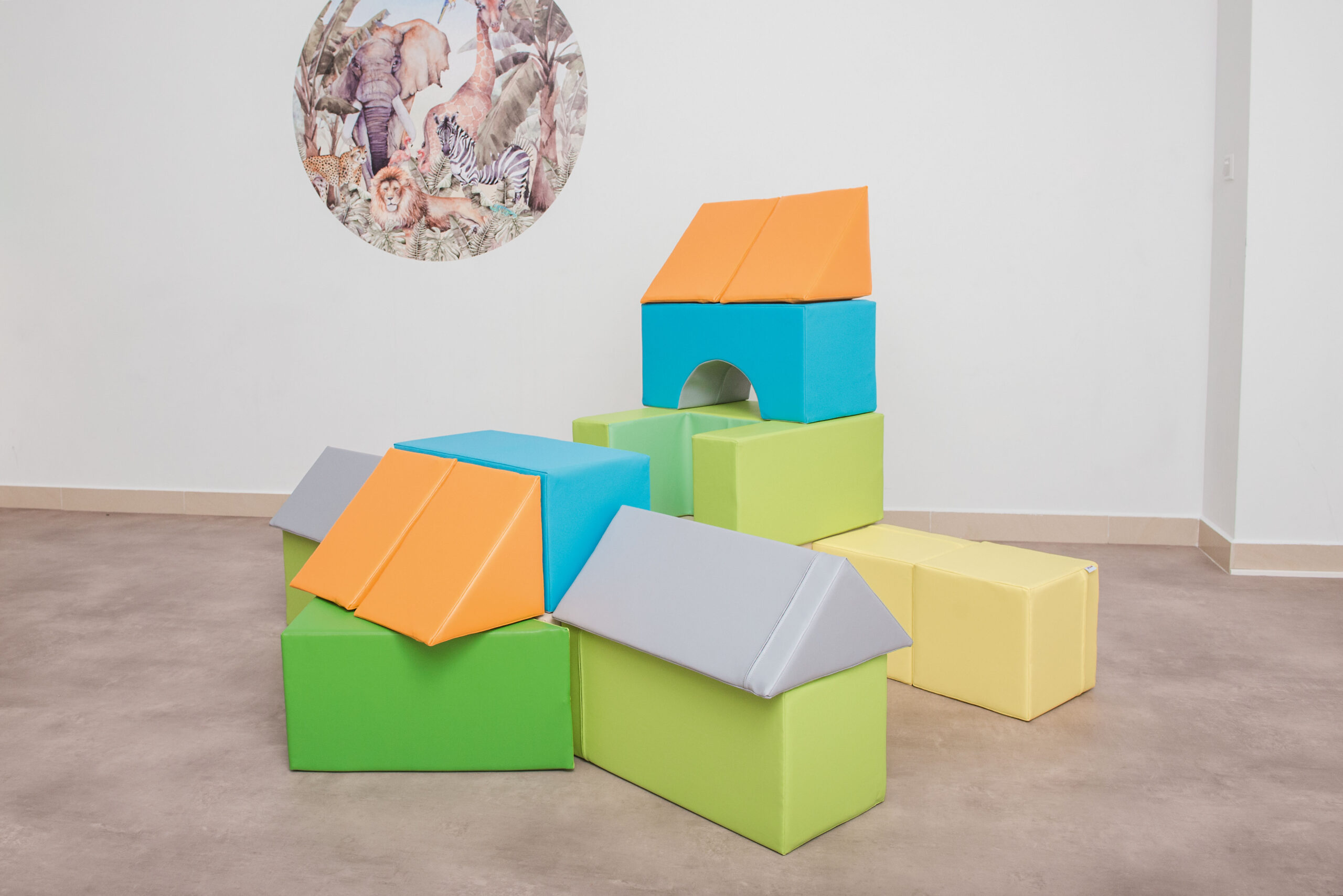 18 dalių spalvingas putplasčio kaladėlių rinkinys, kurio įvairios formos įkvepia kūrybiškai žaisti, o ryškios spalvos skatina vaikus aktyviai įsitraukti. Kaladėlės užpildytos aukštos kokybės putplasčiu, kuris nesideformuoja net intensyviai naudojant. Išorė dengta užvalkalais su užtrauktukais, užtikrinančiais patvarumą ir patogų naudojimą.
