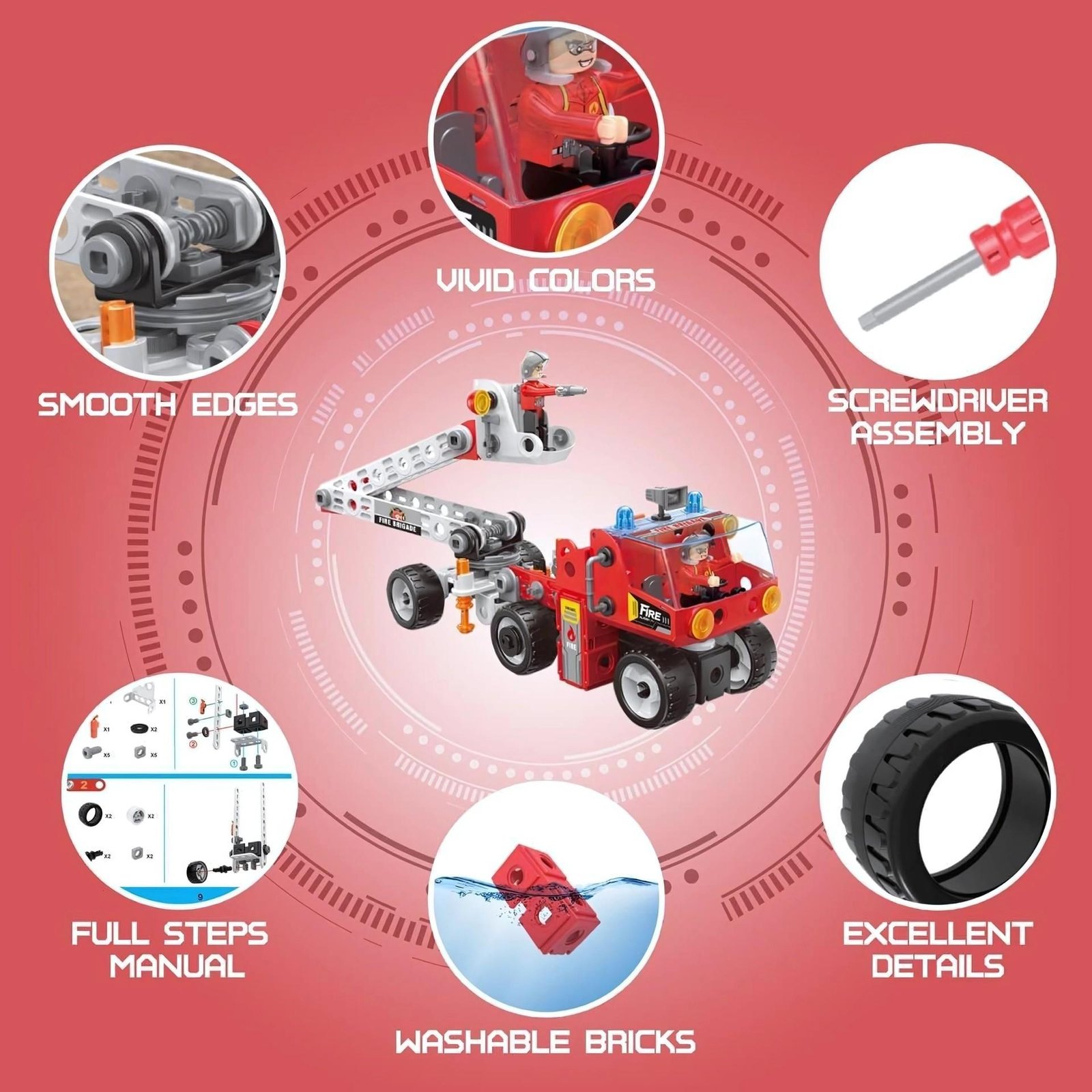 Statybų rinkinys su gaisrininkų tema leidžia surinkti įvairias gelbėjimo transporto priemones. Ryškūs raudoni ir balti elementai bei tvirta konstrukcija užtikrina įtraukiantį vaidmenų žaidimą.