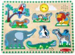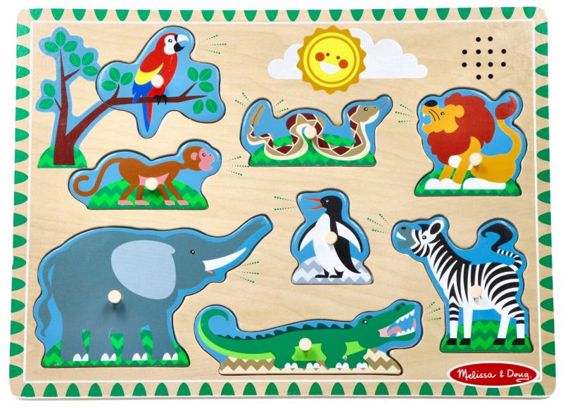 Klausykitės aštuonių mėgstamų zoologijos sodo gyvūnų garsų, kai dėlionės dalys teisingai sudedamos į dėlionės lentą! Po kiekvienu gyvūnu yra spalvotas paveikslėlis. Akį ir ausį traukianti dėlionė lavina derinimo ir klausymo įgūdžius. (PATARIMAS: dėlionė turi šviesos jutiklius; kad pasiektumėte geriausių rezultatų, ryškiai apšviestame kambaryje išimkite detalę, o tada, įdėdami ją į lentą, išgirskite garsą.)
