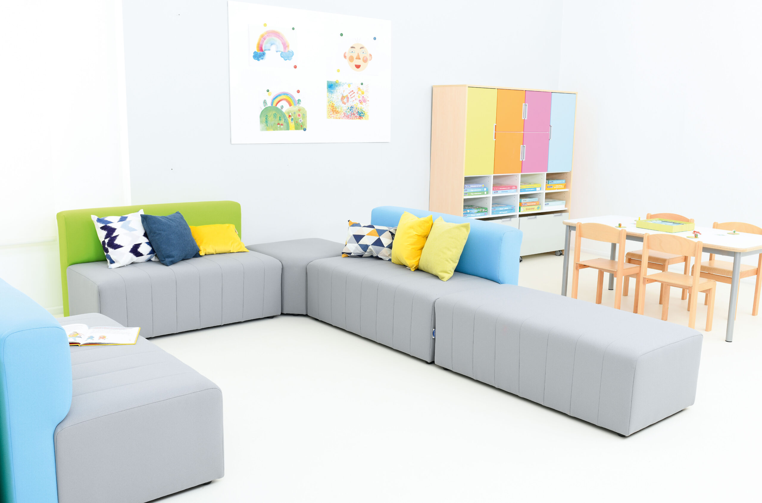 Sėdimosios dalys pagamintos iš putplasčio ant medinio karkaso. Aptrauktos nedegiu audiniu, kuris pasižymi saugumu ir lengva priežiūra. Tinka naudoti įvairiose viešose ar edukacinėse erdvėse.