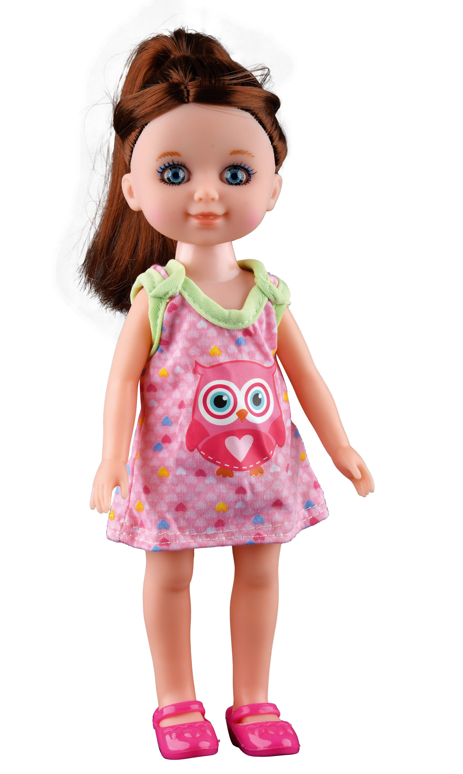 Plastikinė lėlė su kietu kūnu. Lėlės rankos ir kojos judinamos. Pridedami du priedai.