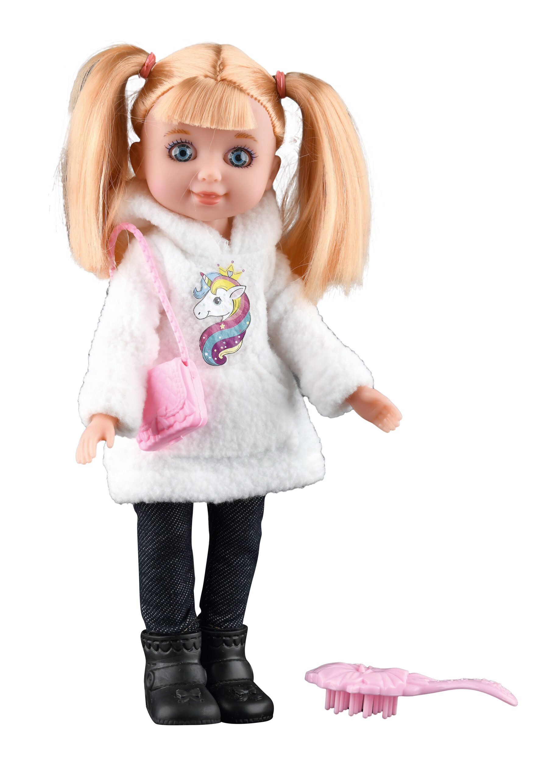 Plastikinė lėlė su kietu kūnu. Lėlės rankos ir kojos judinamos. Pridedami du priedai.