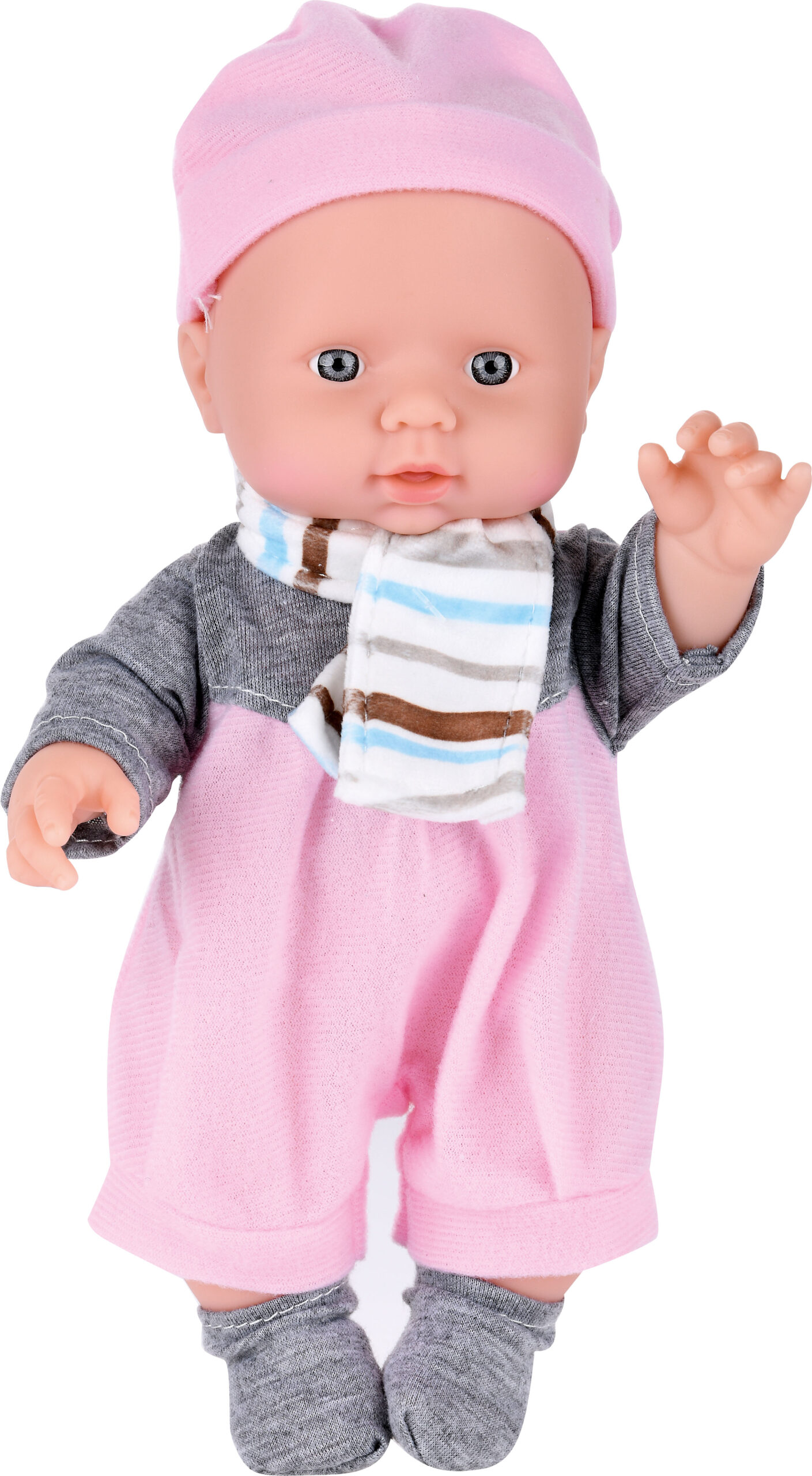 Kūdikio lėlė su minkštu liemeniu, plastikine galva, rankomis ir kojomis. Skleidžia 6 garsus.