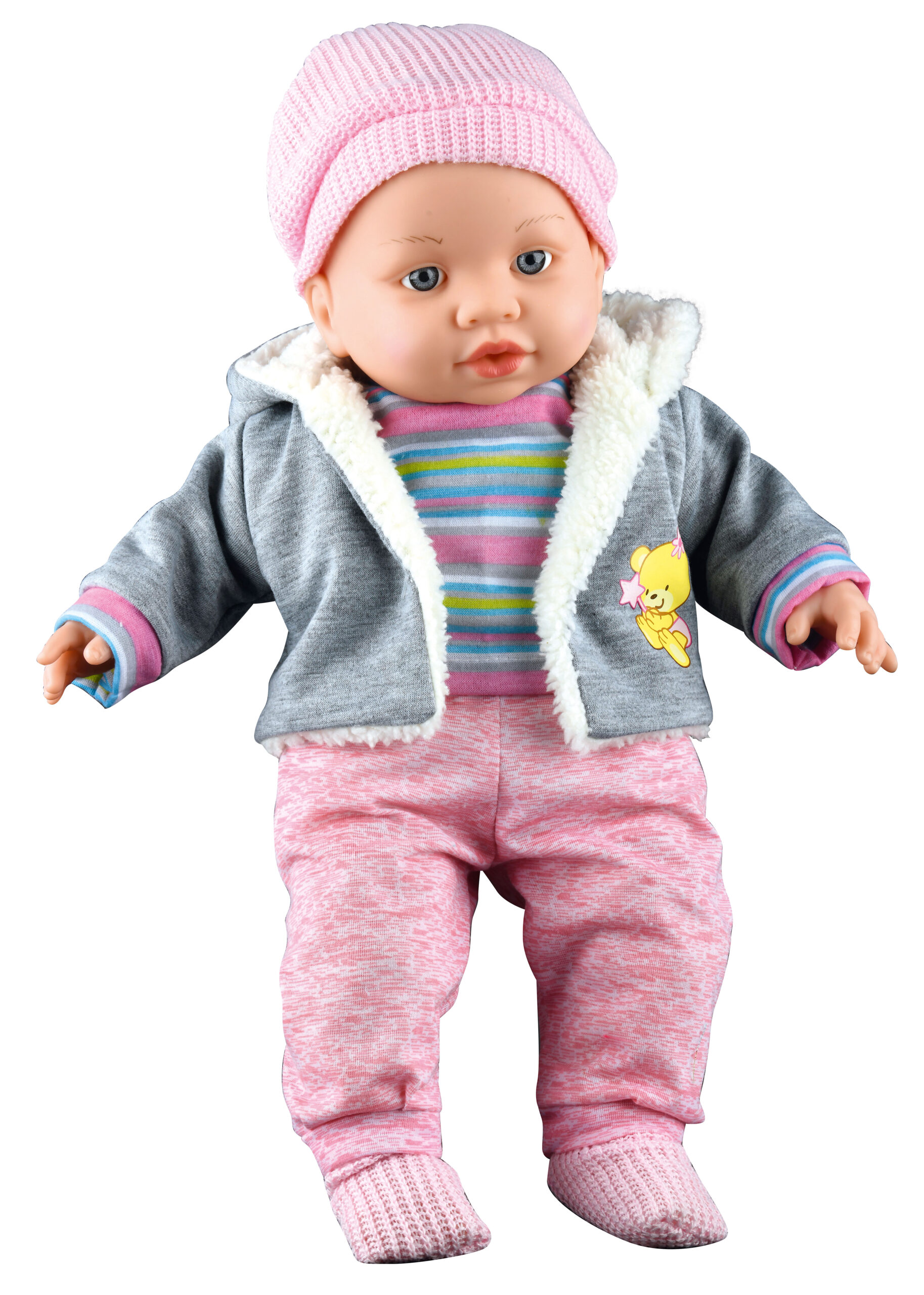 Kūdikio lėlė su minkštu liemeniu, plastikine galva, rankomis ir kojomis. Skleidžia 6 garsus.