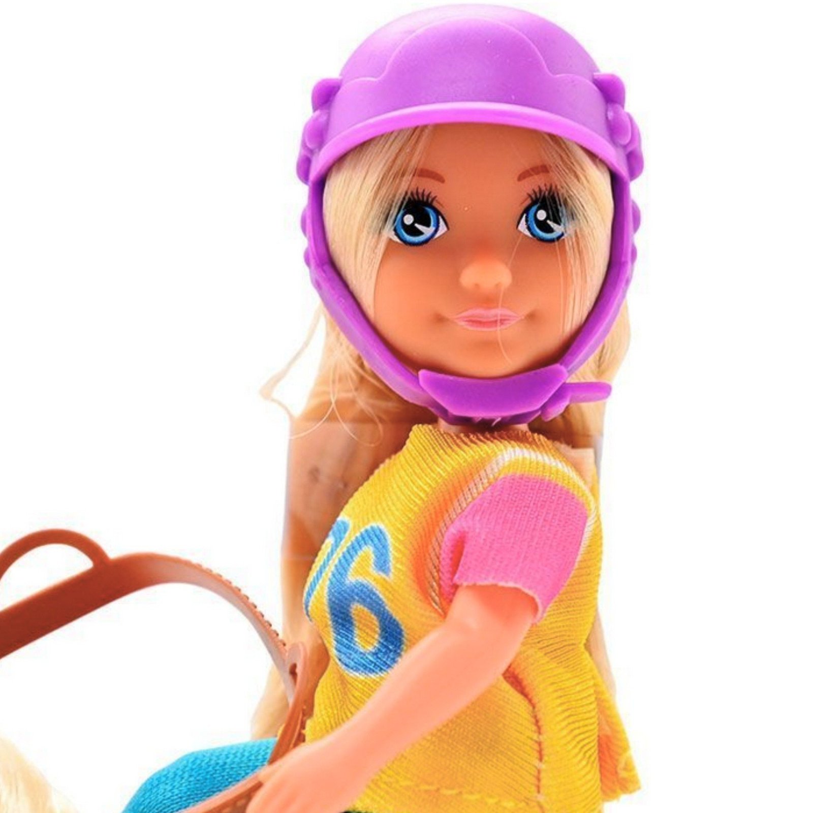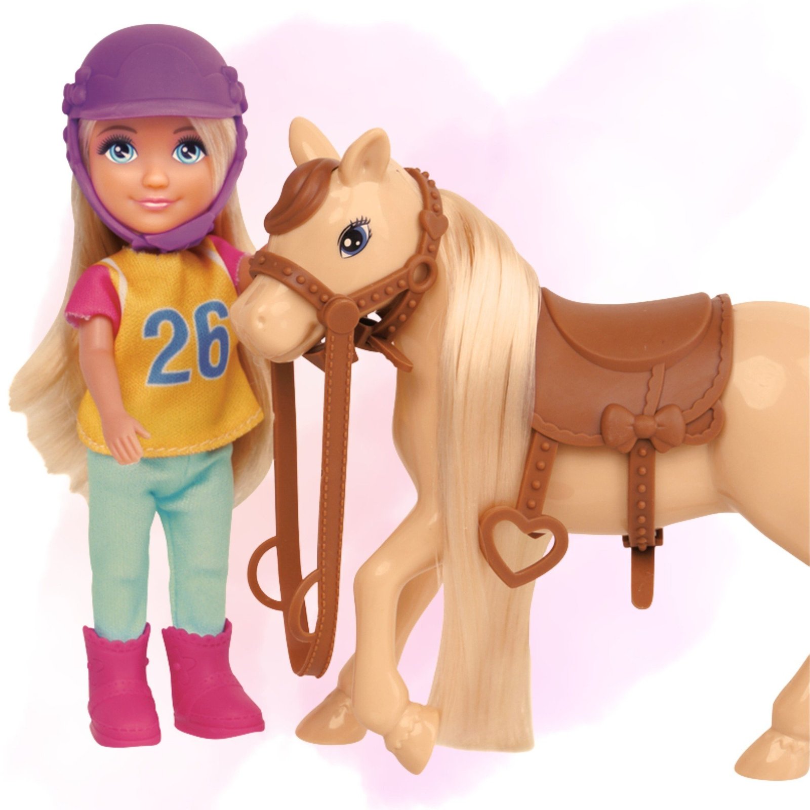 - – Lėlė sėdi ant arklio, matoma balno ir pavadžio, kas skatina vaidmenų žaidimą realistiškose scenose.