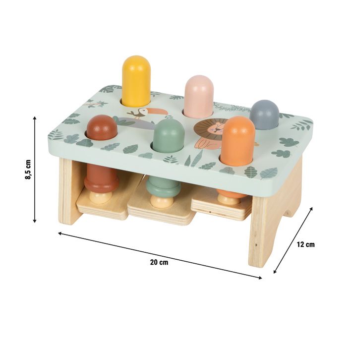 Medinis kalimo žaidimas su safari gyvūnų motyvais. Vaikai plaktuku kala medinius kaištukus – vieną įkalus, kitas išlenda, todėl žaidimas tampa dar įdomesnis.