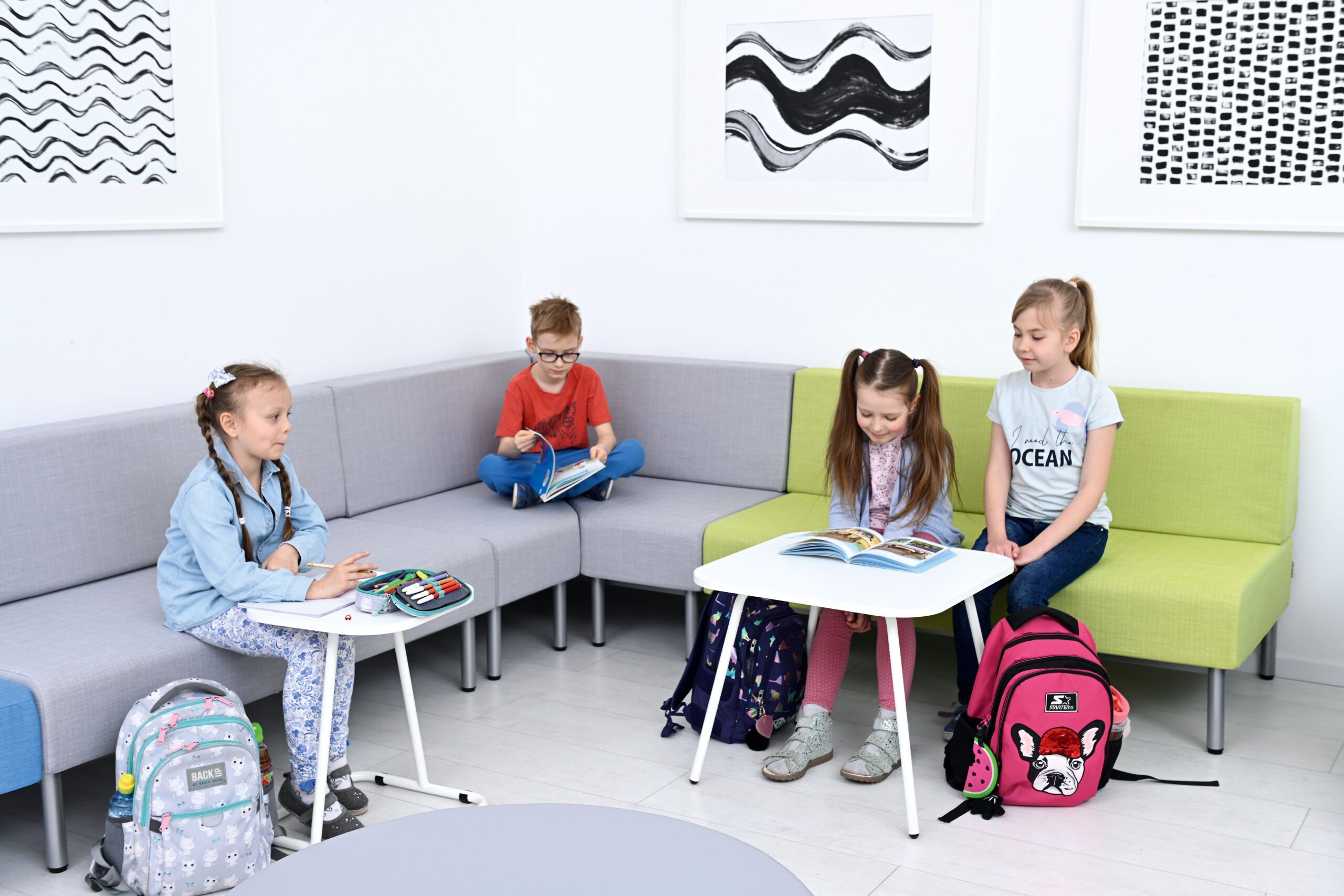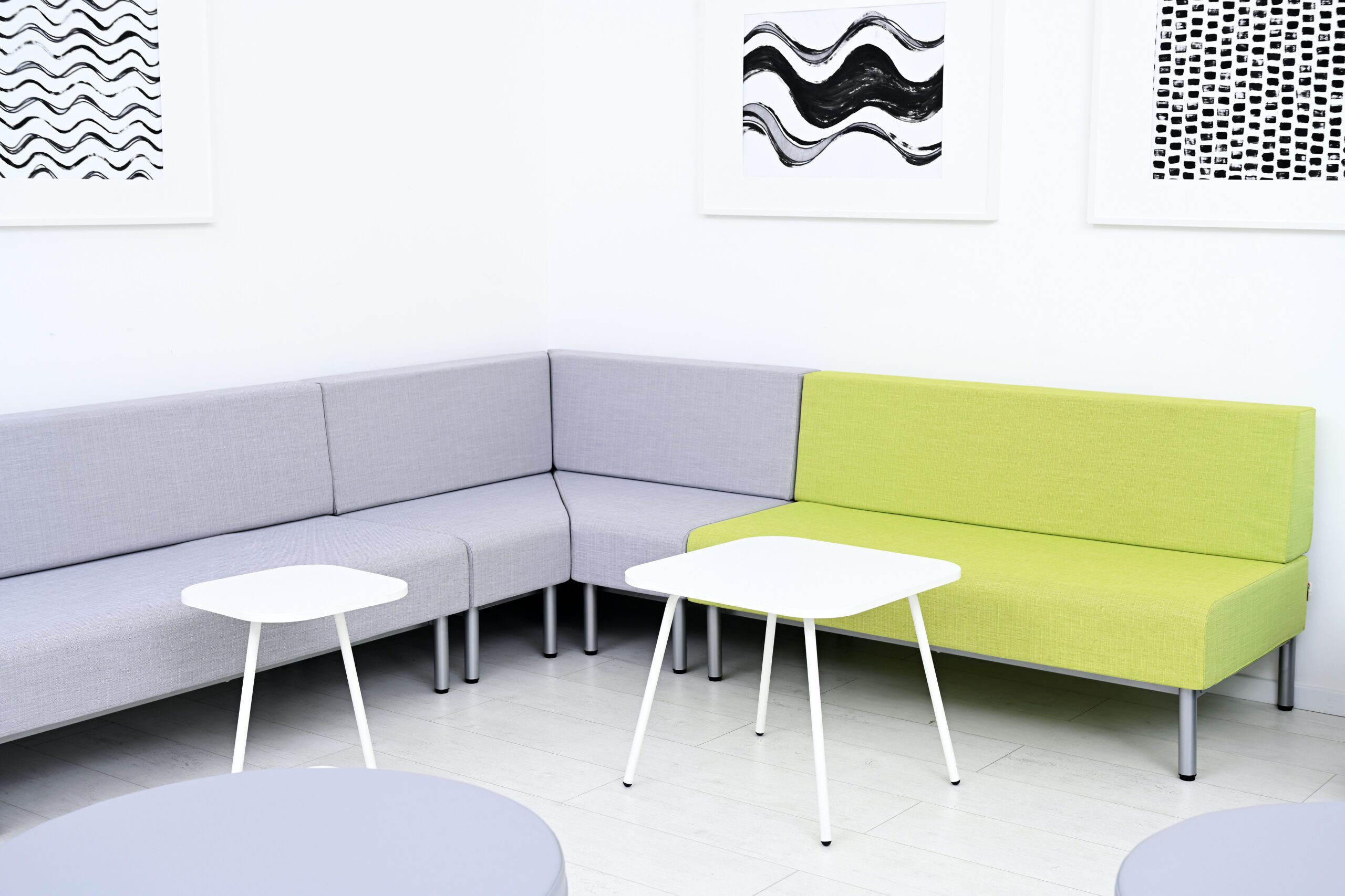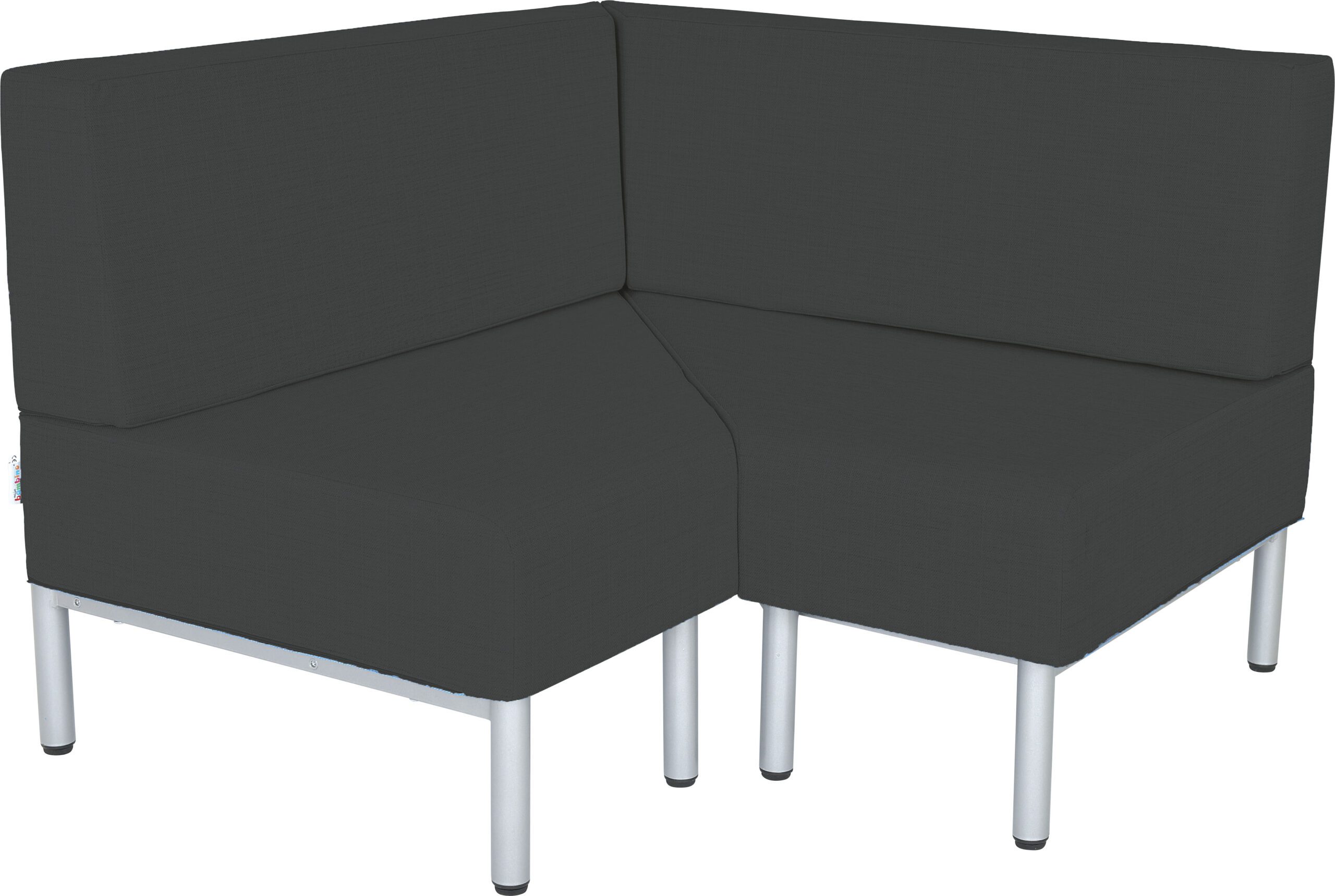 Modernus kampinis fotelis su reguliuojamomis metalinėmis kojelėmis. Dengtas patvariu, dėmėms atspariu audiniu – puikiai tinka darželiams ir mokykloms.