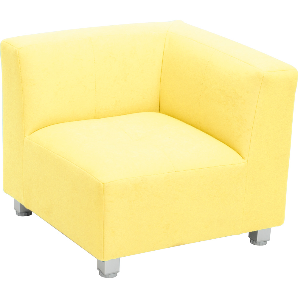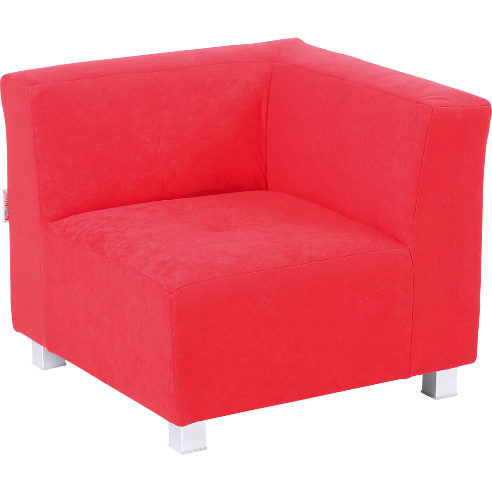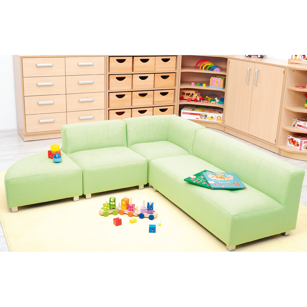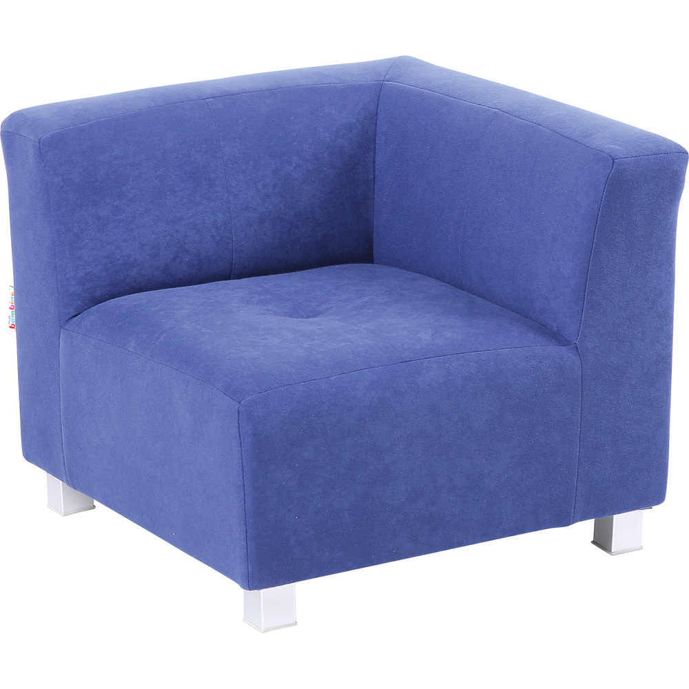 Kampinė sofa su atlošu. Estetiškai pagaminta sėdynė, aptraukta minkštu ir maloniu liesti apmušalų audiniu, matmenys pritaikyti pagal vaikų ūgį. Medinė konstrukcija užtikrina stabilumą ir patogumą mažiesiems naudotojams. Sėdynė pastatyta ant metalinių kojelių. Ji puikiai tinka žaidimams, poilsiui ir bibliotekos kampeliams.