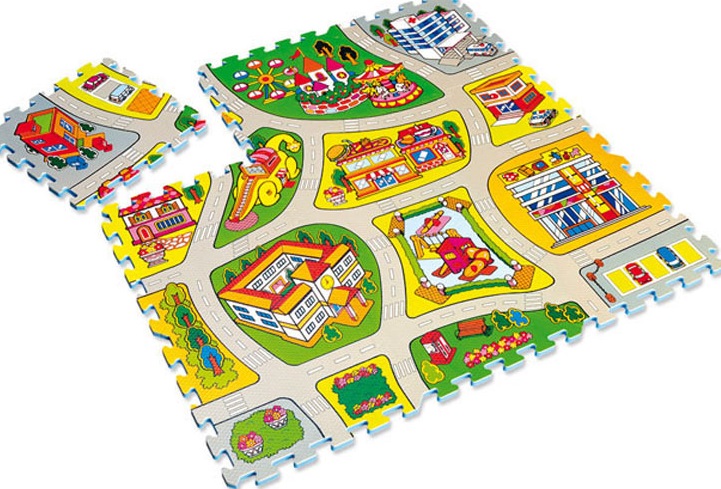 sujungus susidaro kilimėlis su spalvoto miesto piešiniu. Puikiai tinka teminiams ir edukaciniams žaidimams, pvz., mokantis kelių eismo taisyklių. Dėl universalių, be rašto kraštų kelis kilimėlius galima sujungti į vieną, kaip dėlionę.
