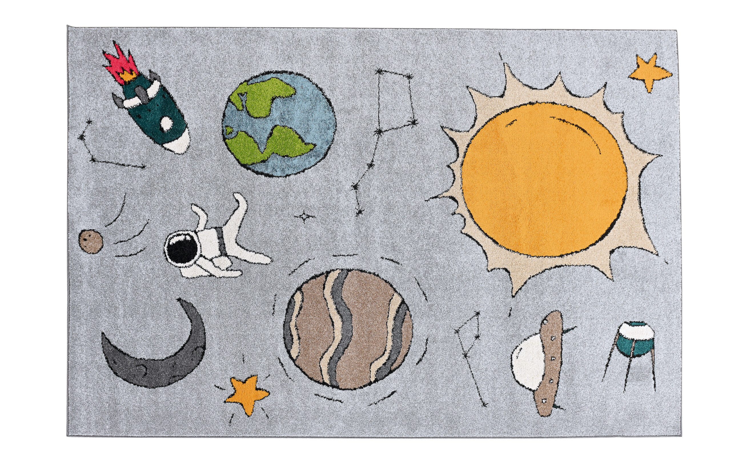 Kosmoso tematikos kilimas, pilkos spalvos atspalvių, pagamintas iš polipropileno. Pūko aukštis apie 8 mm.