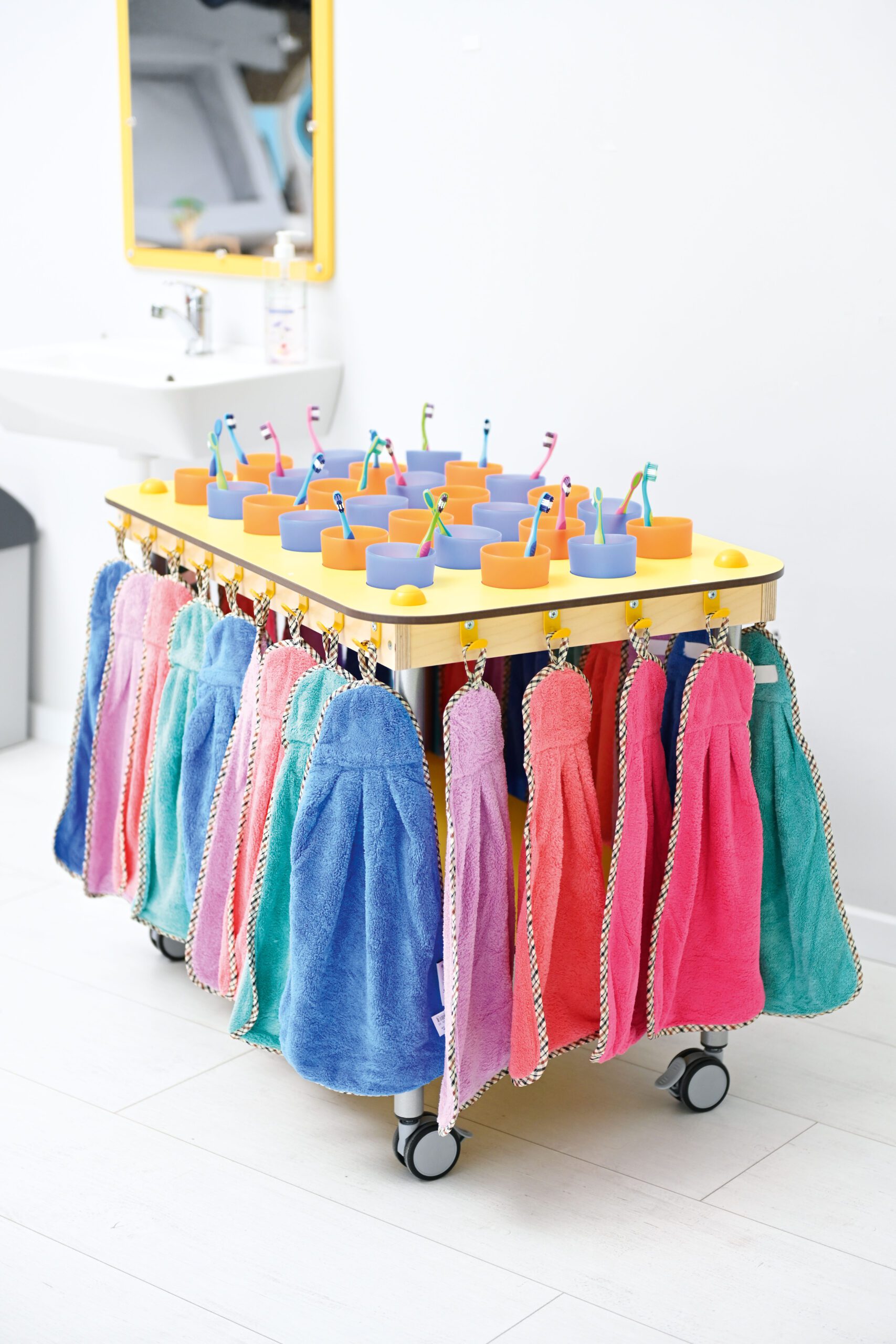 Maži rankšluosčiai su kilpele. Juose yra įsiūta etiketė, ant kurios galima užrašyti vaiko vardą. • 6 vnt. • matmenys 44 x 30 cm • etiketės matmenys 7 x 2 cm