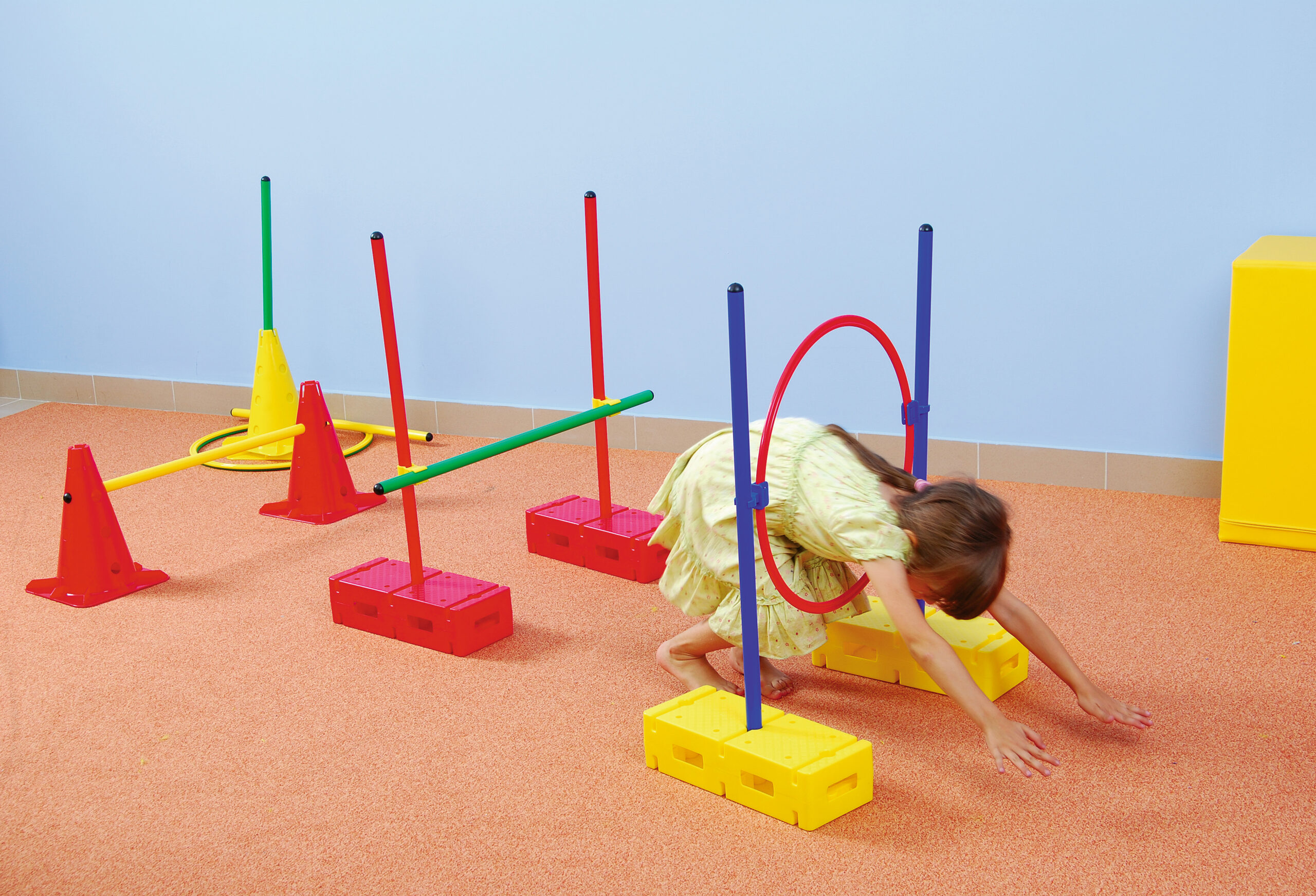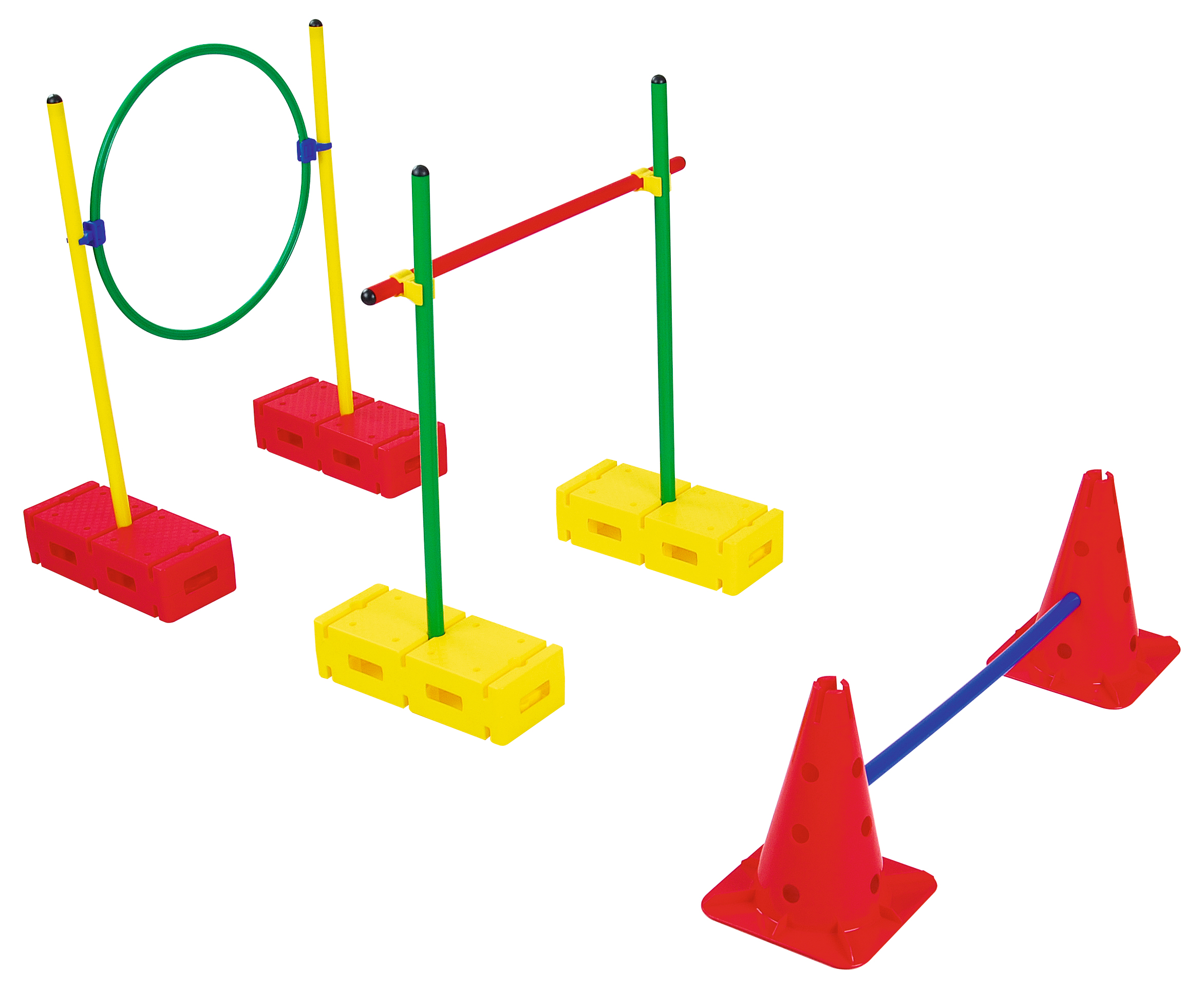 Daugelio elementų rinkinys, leidžiantis sukurti įvairius kliūčių ruožus ir įdomias gimnastikos pratimų priemones.