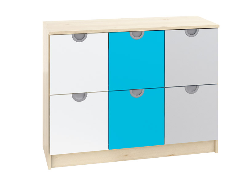 6 stalčiai, matmenys: 37 x 37 x 37 cm; konstrukcija iš 18 mm storio laminuotos medžio drožlių plokštės (2 baltos, 2 mėlynos ir 2 pilkos spalvos), šonai ir nugarėlė – beržo, dugnas – 3,2 mm HDF;