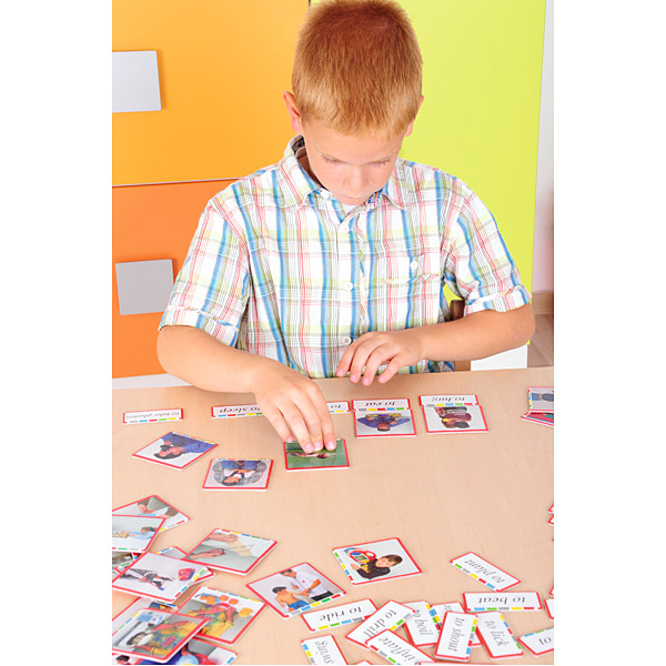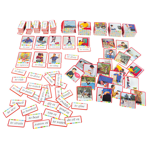 Įvairios pagalbinės priemonės žodynui pristatyti ir įtvirtinti, puikiai tinka kalbiniams žaidimams. Sudėjus korteles į krūvą, lengviau prisiminti taisyklingą rašybą ir žodyną. Spalvotos juostelės ant paveikslėlių padeda vaikui savarankiškai stebėti, todėl jis gali dirbti savarankiškai arba padedamas mokytojo. Rinkinį sudaro: – 108 7 x 7 cm dydžio nuotraukos – 108 7 x 3 cm dydžio užrašai – instrukcijos