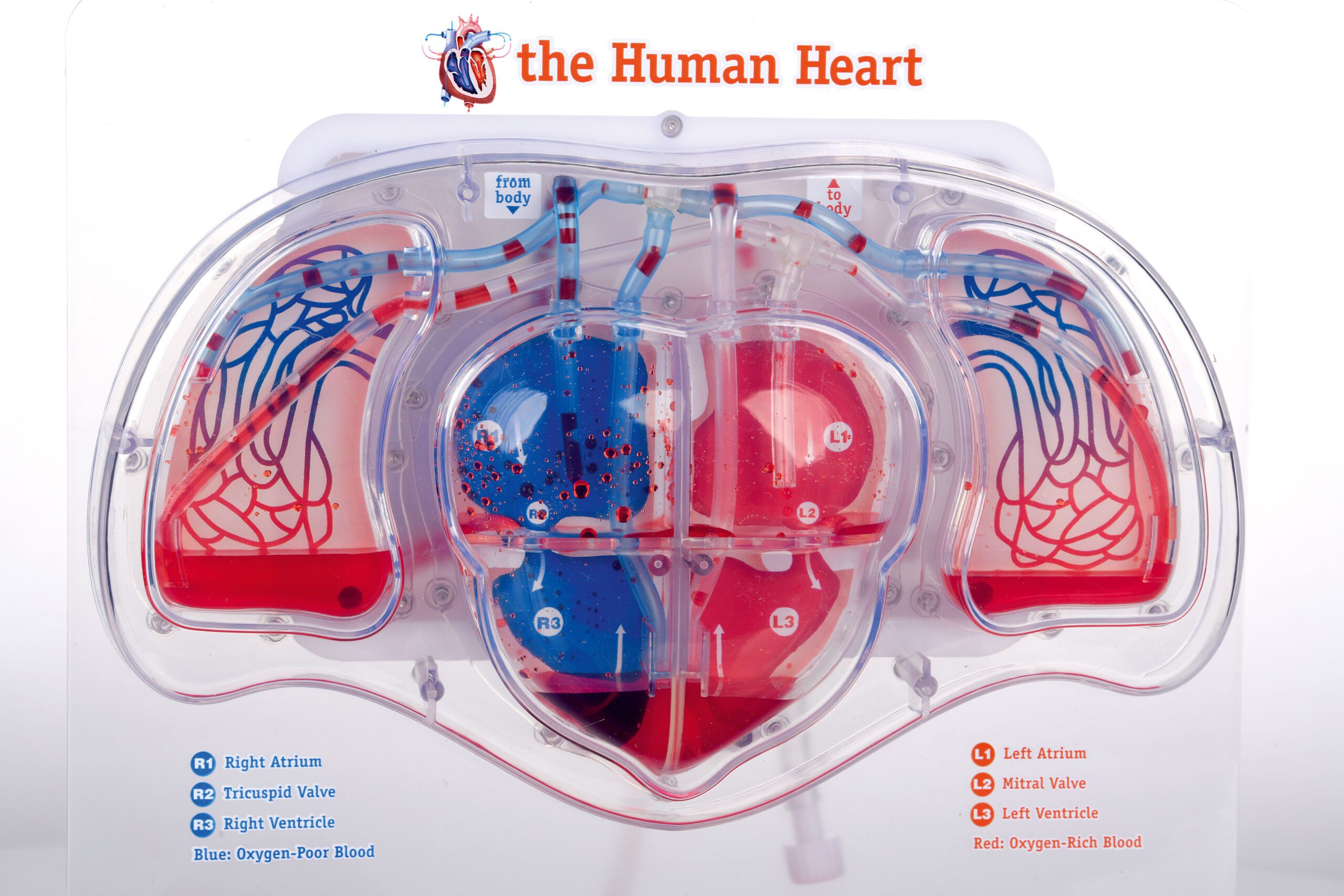 Modelis veikia spaudžiant rankinę pompą ir leidžia stebėti pagrindinę kraujo tėkmę širdyje bei plaučiuose. Pažymėti širdies skilveliai, pagrindinė arterija, venos ir plaučiai. Pagamintas iš plastiko. Komplekte – 10 spalvotų maišelių.