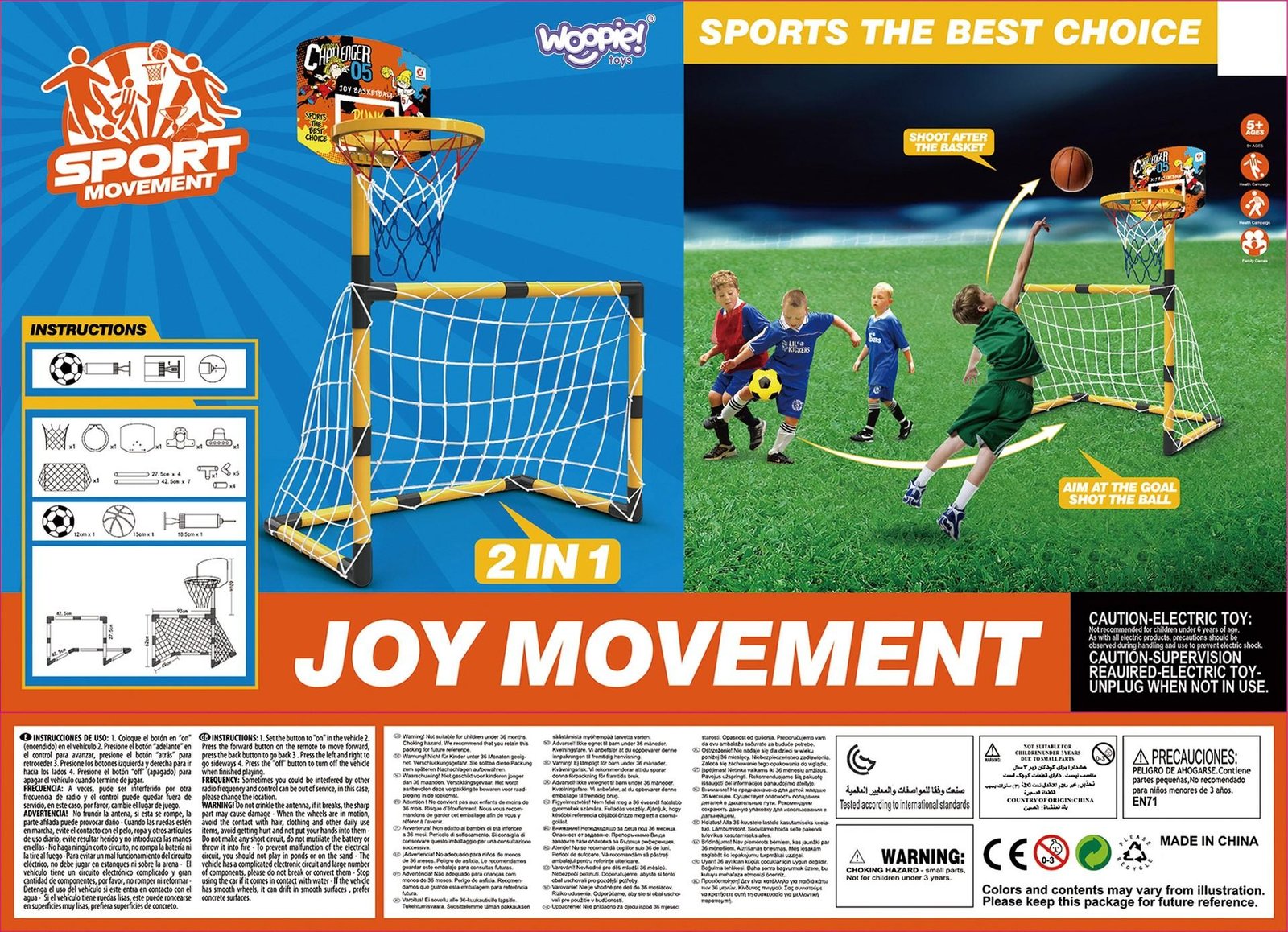 Krepšinio ir Futbolo Rinkinys – žaislas vaikams nuo 3 metų, tinkamas žaisti viduje ir lauke. Rinkinyje yra krepšinio krepšys (aukštis 125 cm), futbolo vartai ir kamuolys. Lengvai surenkamas, patvarus ir saugus, lavina stambiuosius motorinius įgūdžius bei skatina vaikų fizinį aktyvumą.