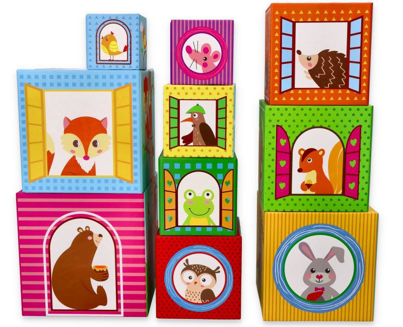 Skatina anksti pradėti skaičiuoti nuo vieno iki dešimties. Ryškūs ir spalvingi rankų darbo kartoniniai kubeliai. Mokymasis pažinti spalvas, skaičius ir gyvūnus.