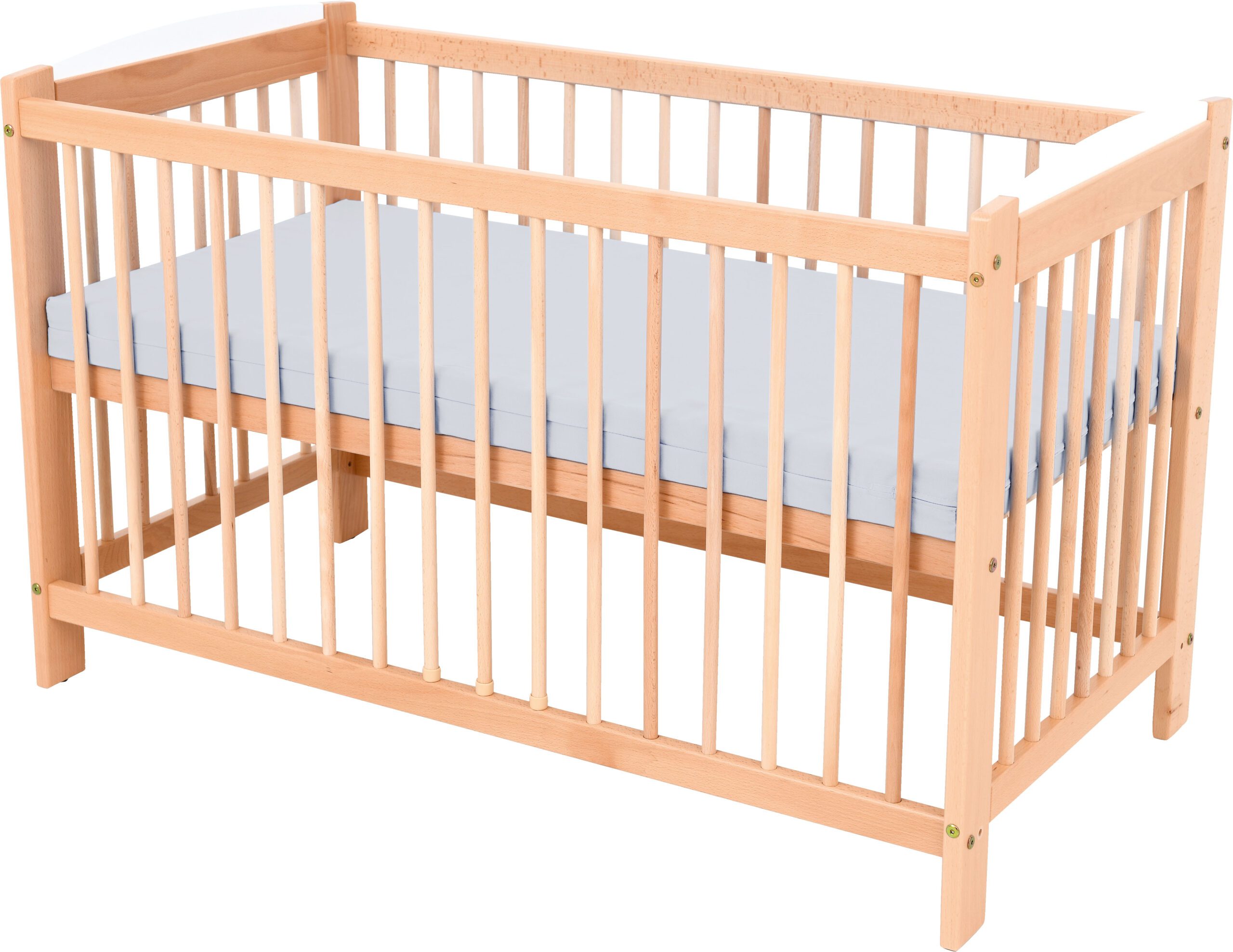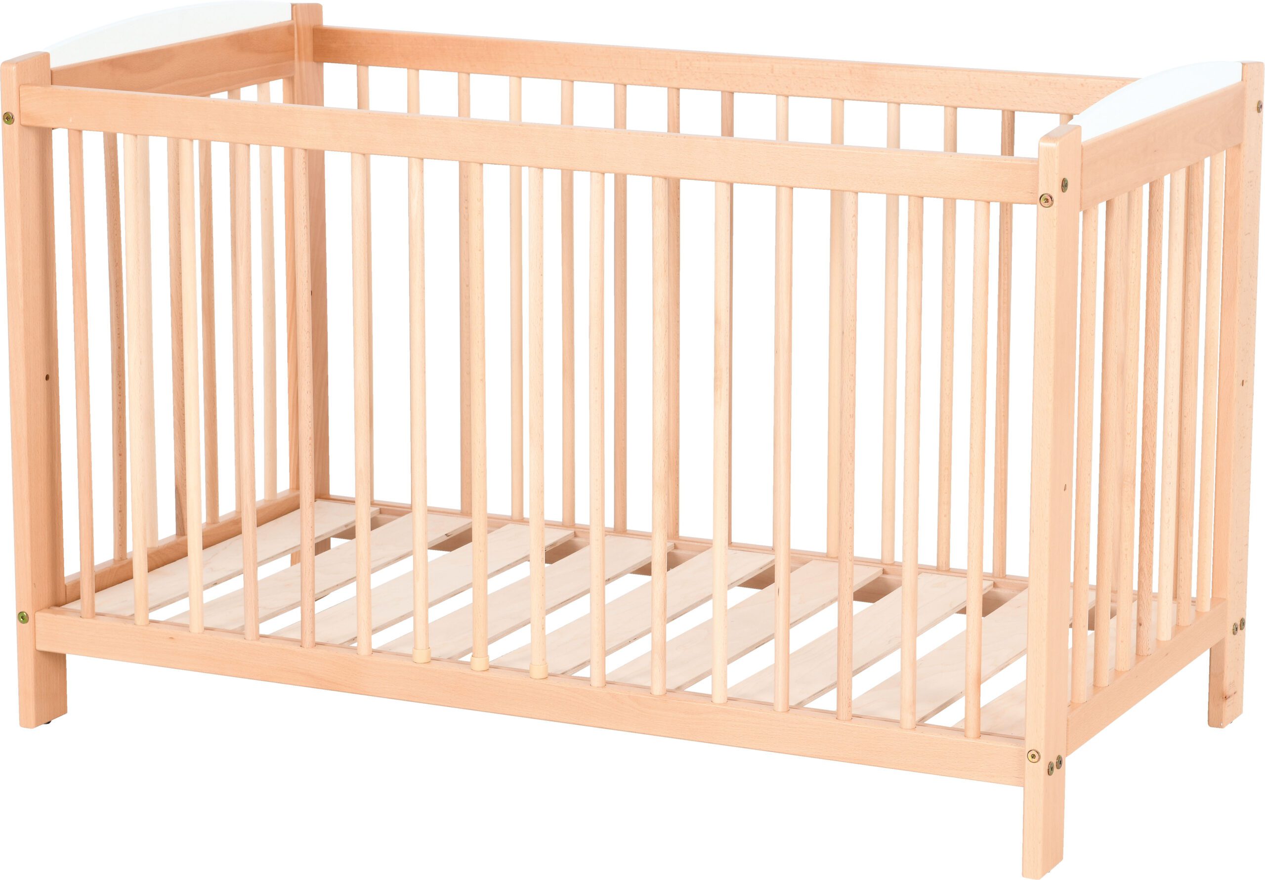 Kūdikių lovelė, pagaminta iš lakuotos medienos su spalvinga aplikacija, turinti du lovos aukščio reguliavimo lygius ir nuimamas groteles.